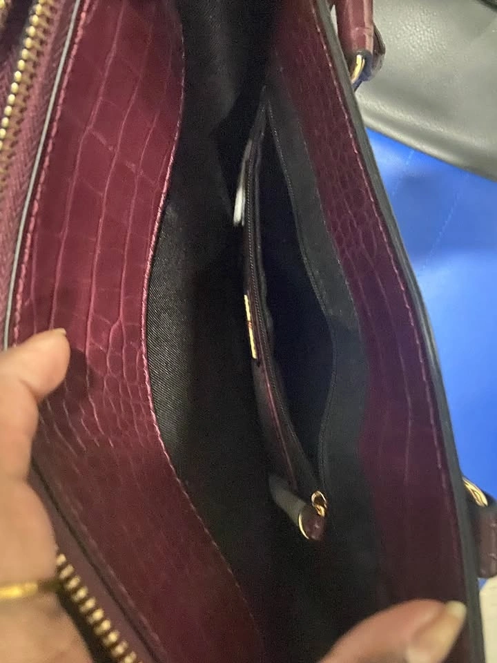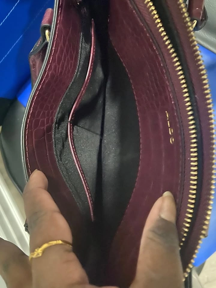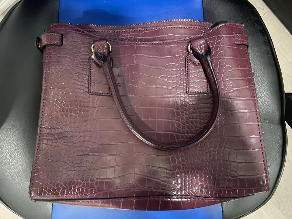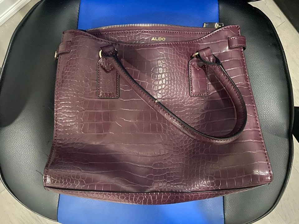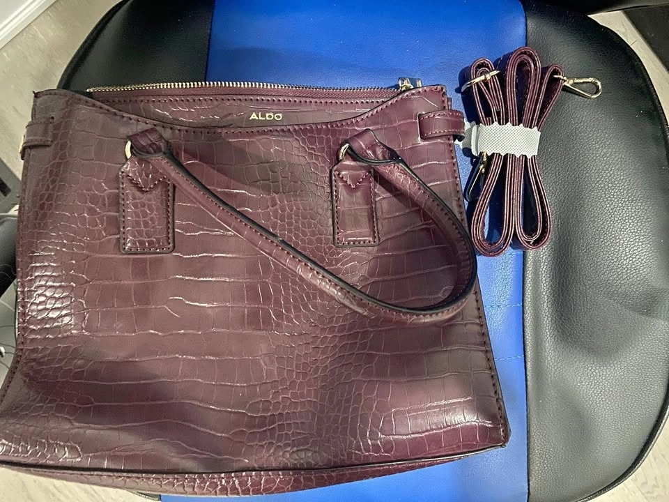 I’m selling a Maroon Aldo purse with a snakeskin pattern for $30. It’s in great condition and hasn’t been used much at all. Plus, it includes a body strap that’s brand new. You can see in the pictures that it has three compartments, including a zipper one.