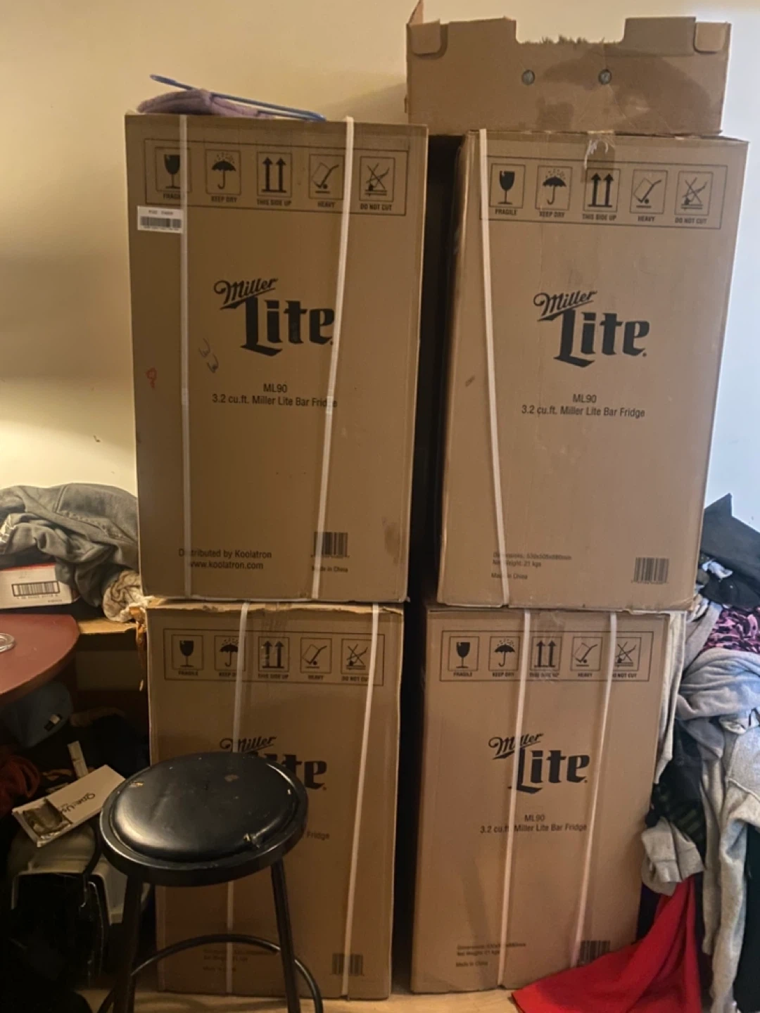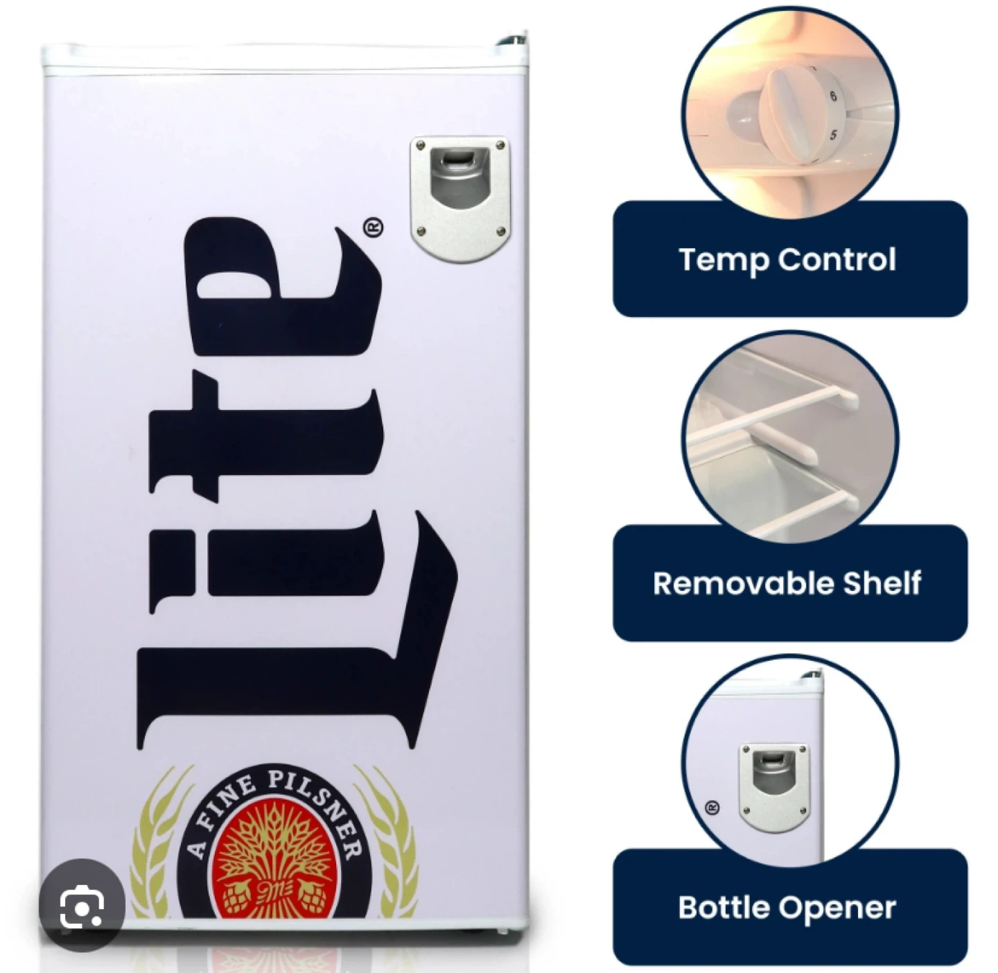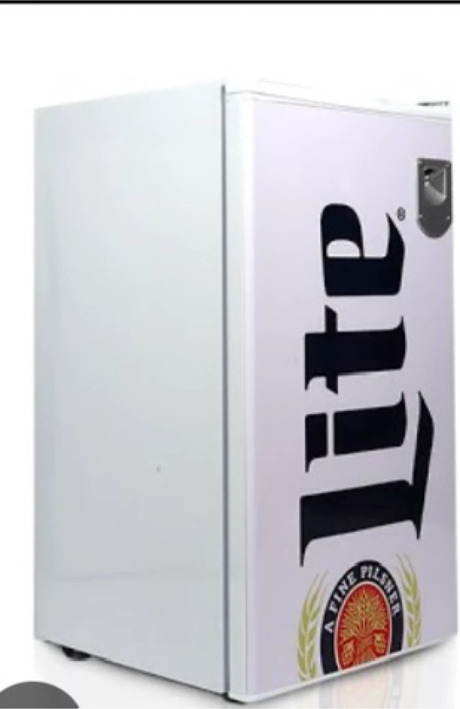 Keep your favourite beverages chilled with this Miller Lite mini fridge! It's got a temperature control, a removable shelf, and even a bottle opener on the side. Perfect for a dorm room, office, or man cave. Brand new in the box . For inquiry text 2265838883 or message on chat.