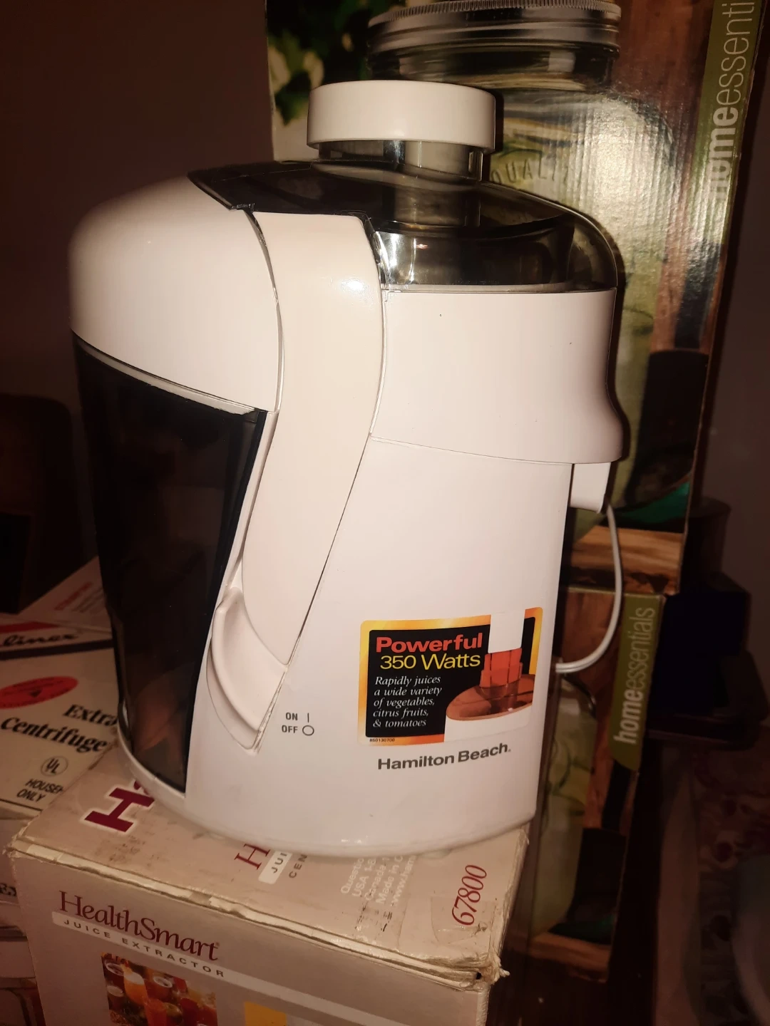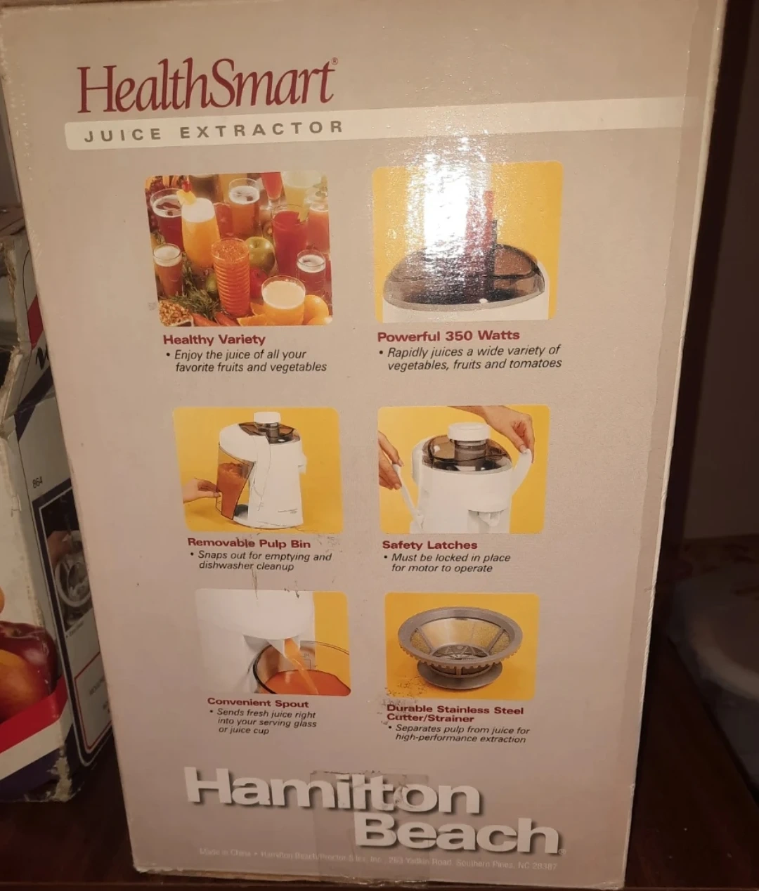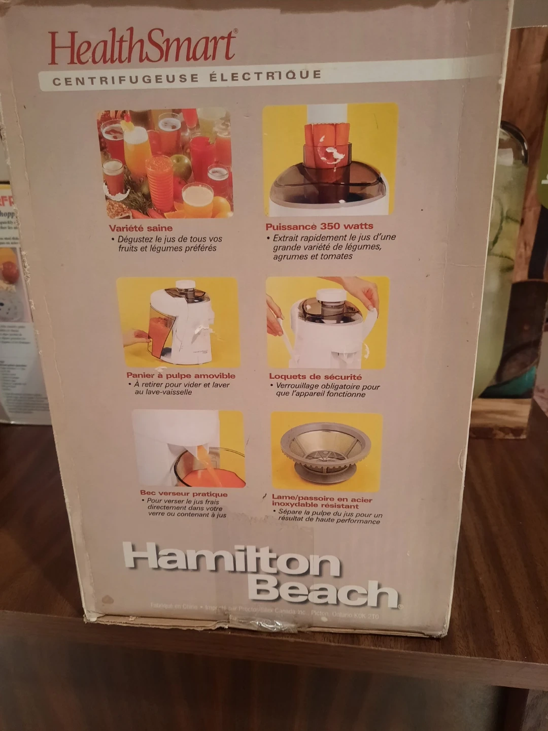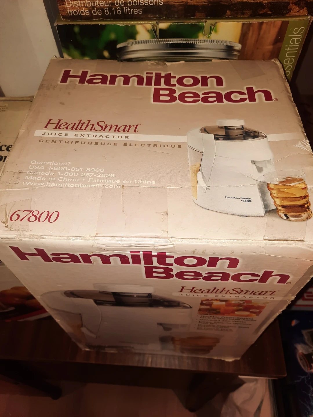 Selling a Hamilton Beach HealthSmart juice extractor. It features a durable stainless steel cutter/strainer and a large, easy-to-remove pulp bin. This juice extractor is perfect for making healthy, fresh-tasting fruit and vegetable juices. It operates at 350 watts. Comes with the original box.