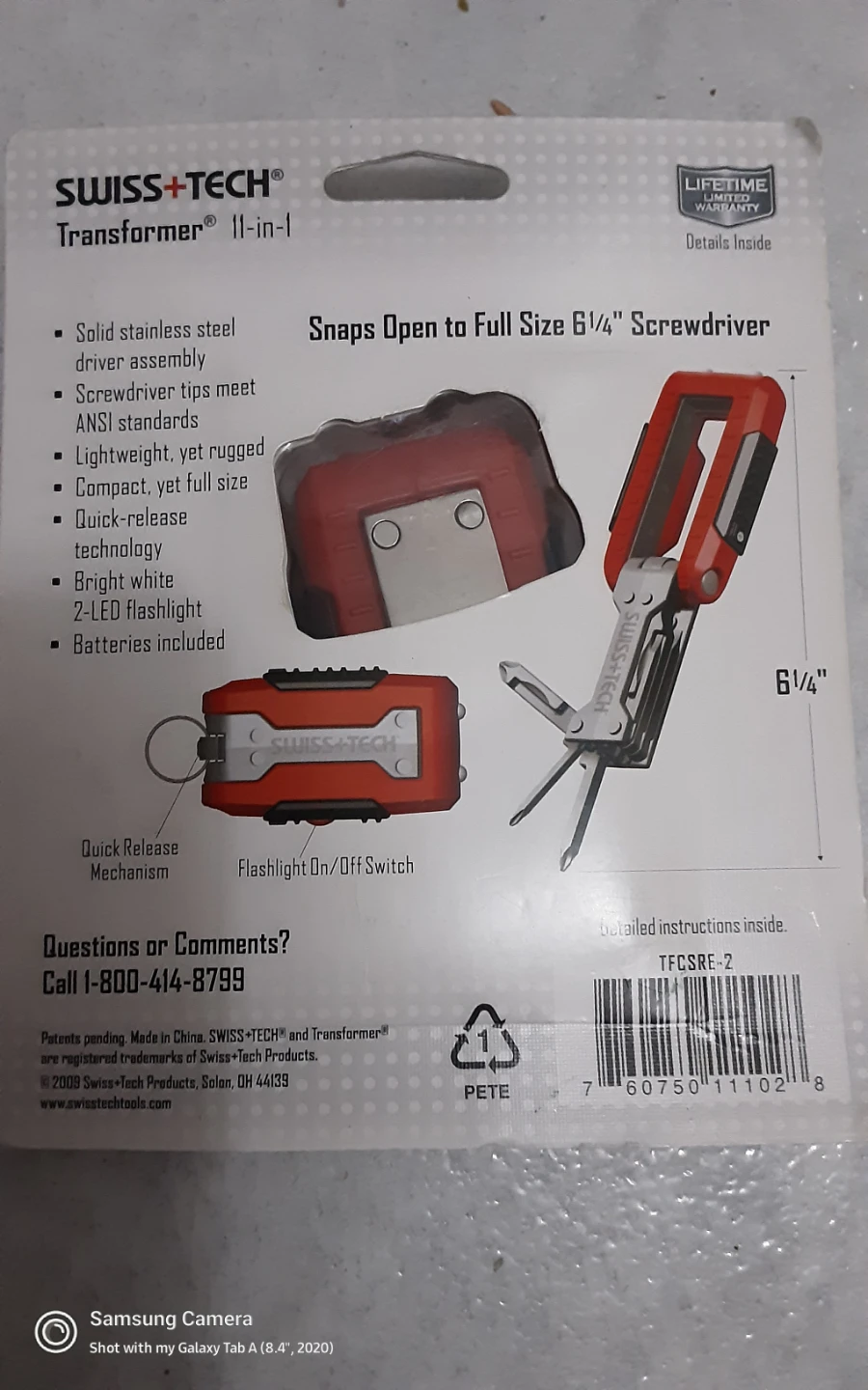 Selling a Swiss+Tech Transformer 11-in-1 Keyring Tool Set! It features a solid stainless steel driver assembly and screwdriver tips that meet ANSI standards. It's lightweight, yet rugged, and compact. It also has quick-release technology and a bright white 2-LED flashlight. Batteries are included!
