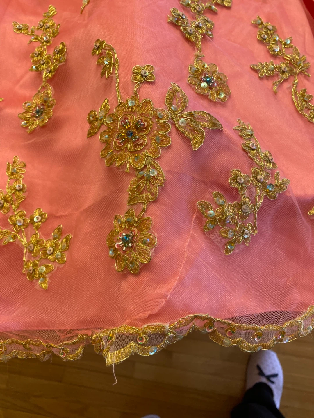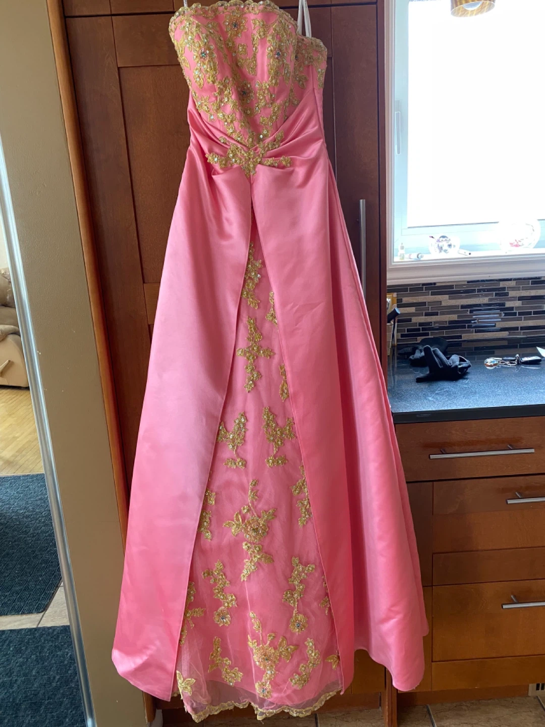 Selling a beautiful pink gown by Tiffany Designs. It features lovely gold detailing. Perfect for a special occasion! Has a slight snag at the bottom but not at all noticeable.