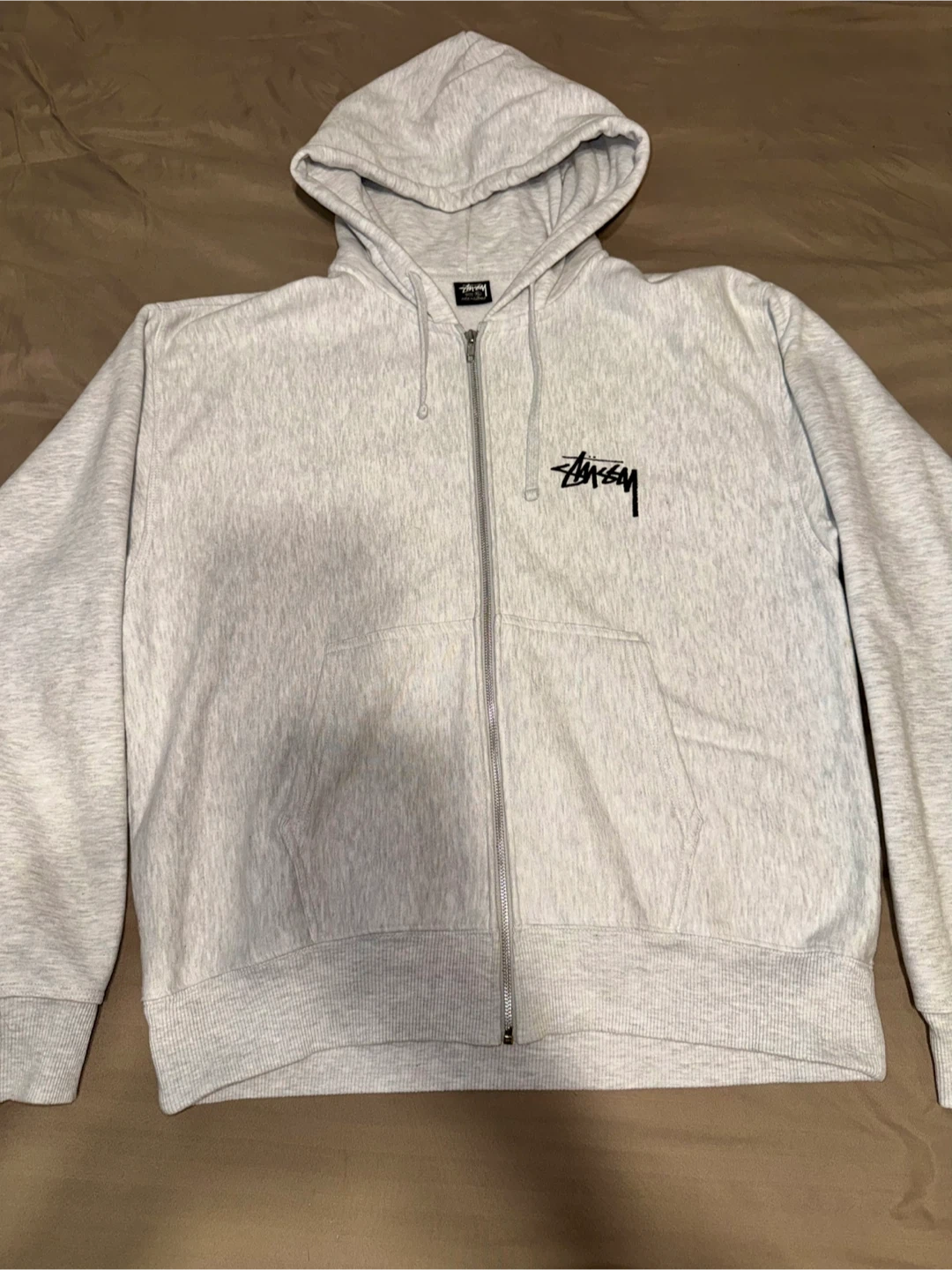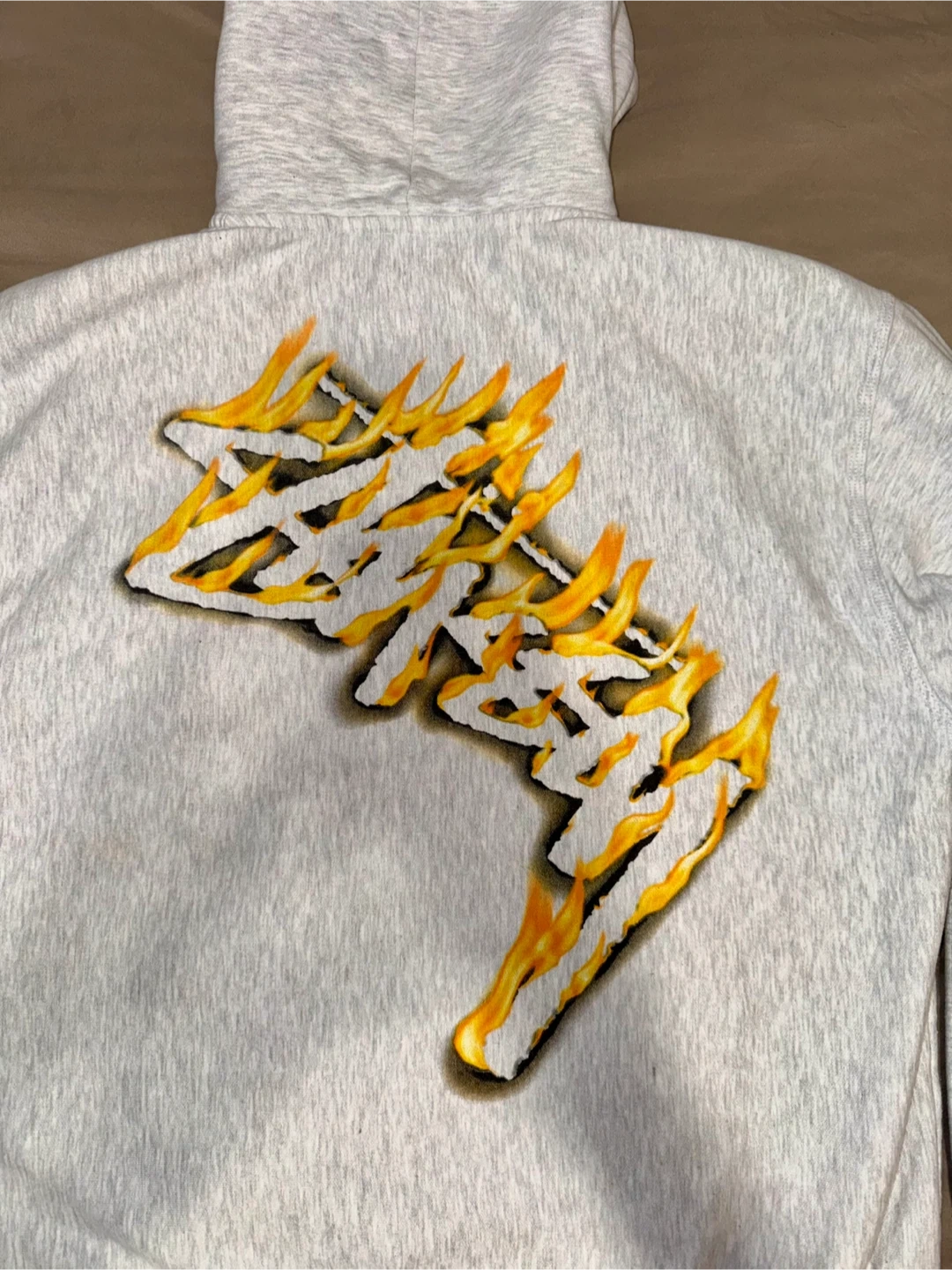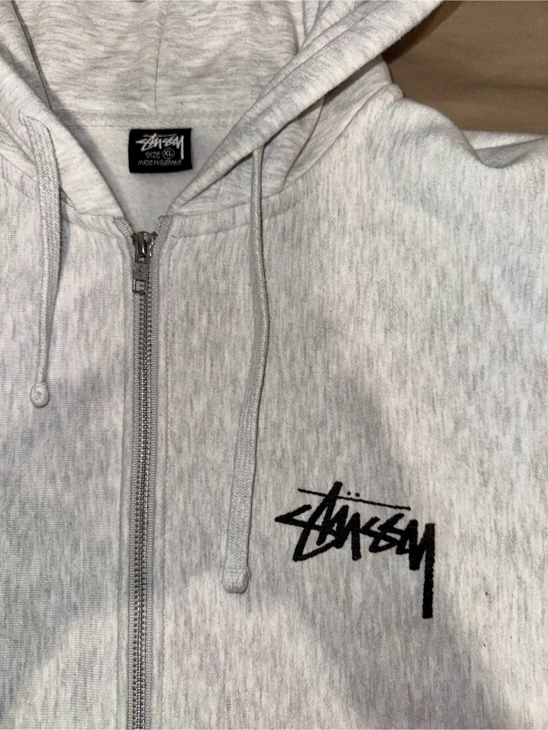 Here's a Stussy Burning logo zip-up hoodie in size XL! It's made of 75% cotton and 25% polyester. It's got a cool design on the back and the Stussy logo on the front. Good condition. For pick up and cash only…