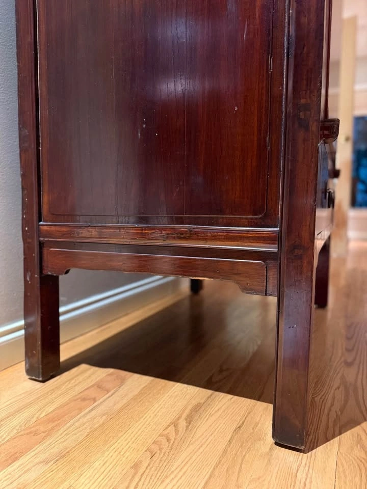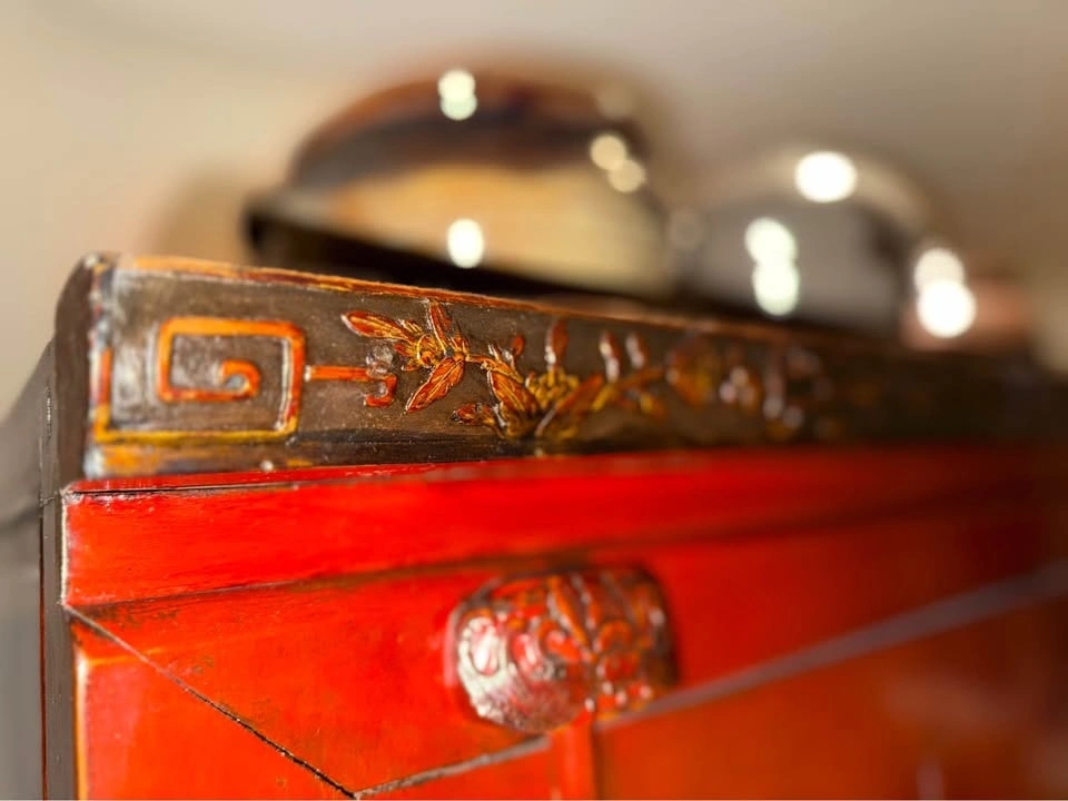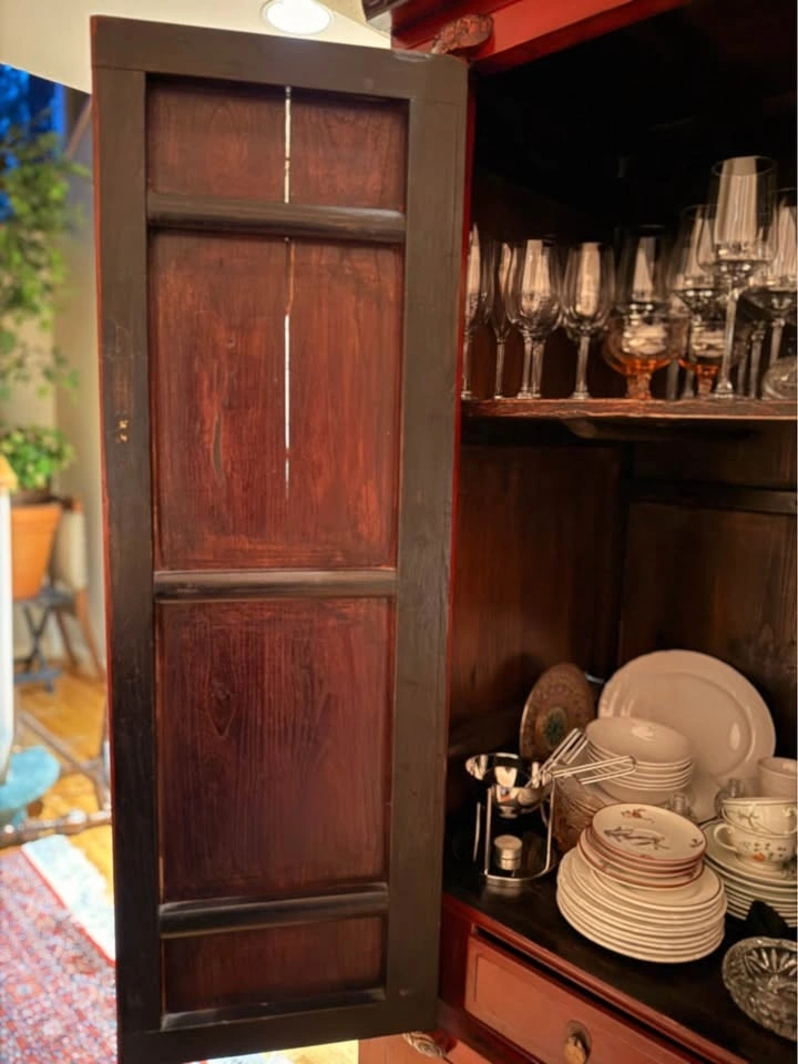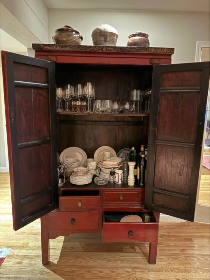 Beautiful solid-wood Chinese wedding cabinet in excellent condition. Rich red lacquer front with large round brass moon hardware and two lower drawers. Tons of interior storage — perfect as a bar cabinet, wardrobe, entryway statement piece, or dining room display.
