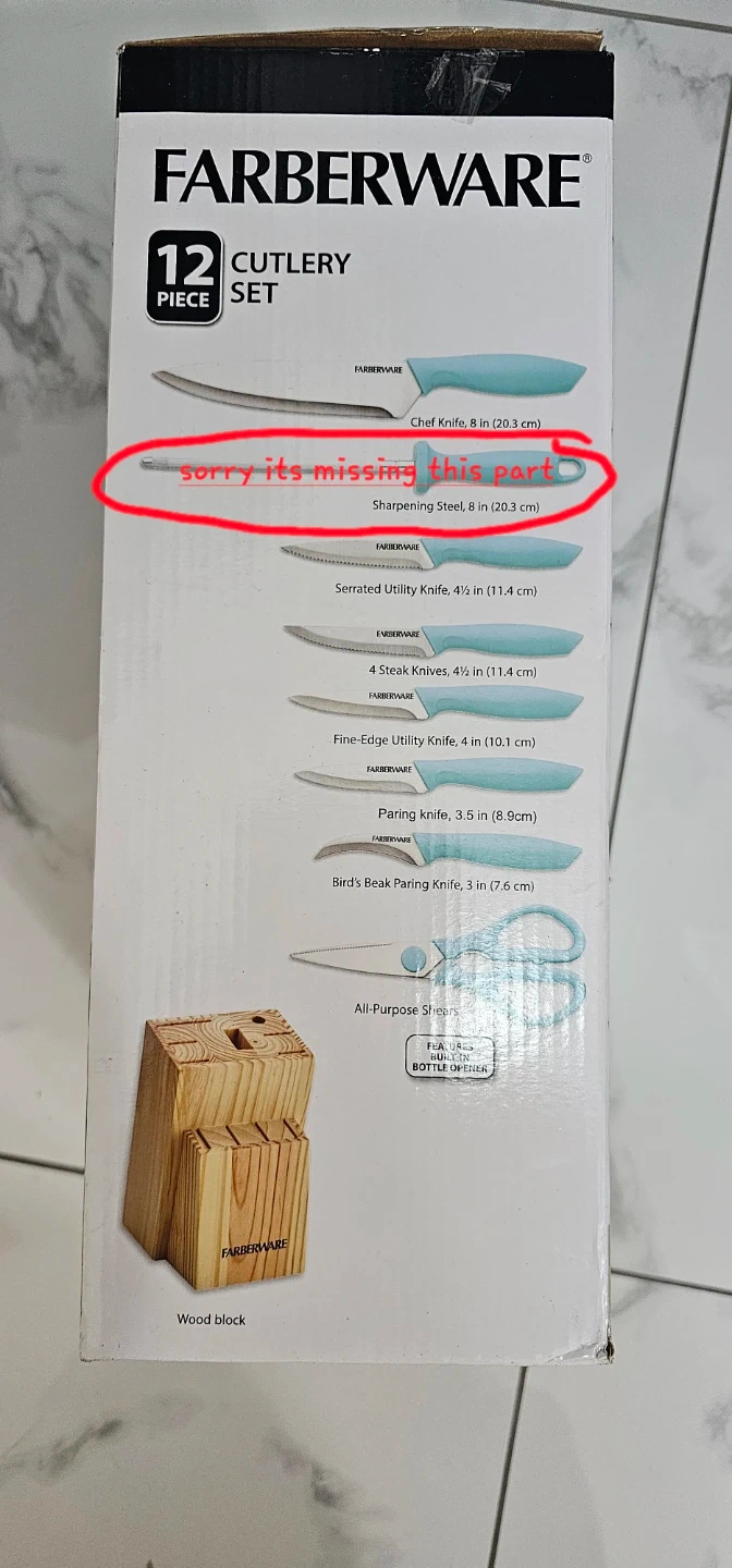 Selling a Farberware 12-piece cutlery set. This set features high-carbon stainless steel blades for strength and durability, and ergonomically designed handles for comfort while cutting. Please note that the sharpening steel is missing.