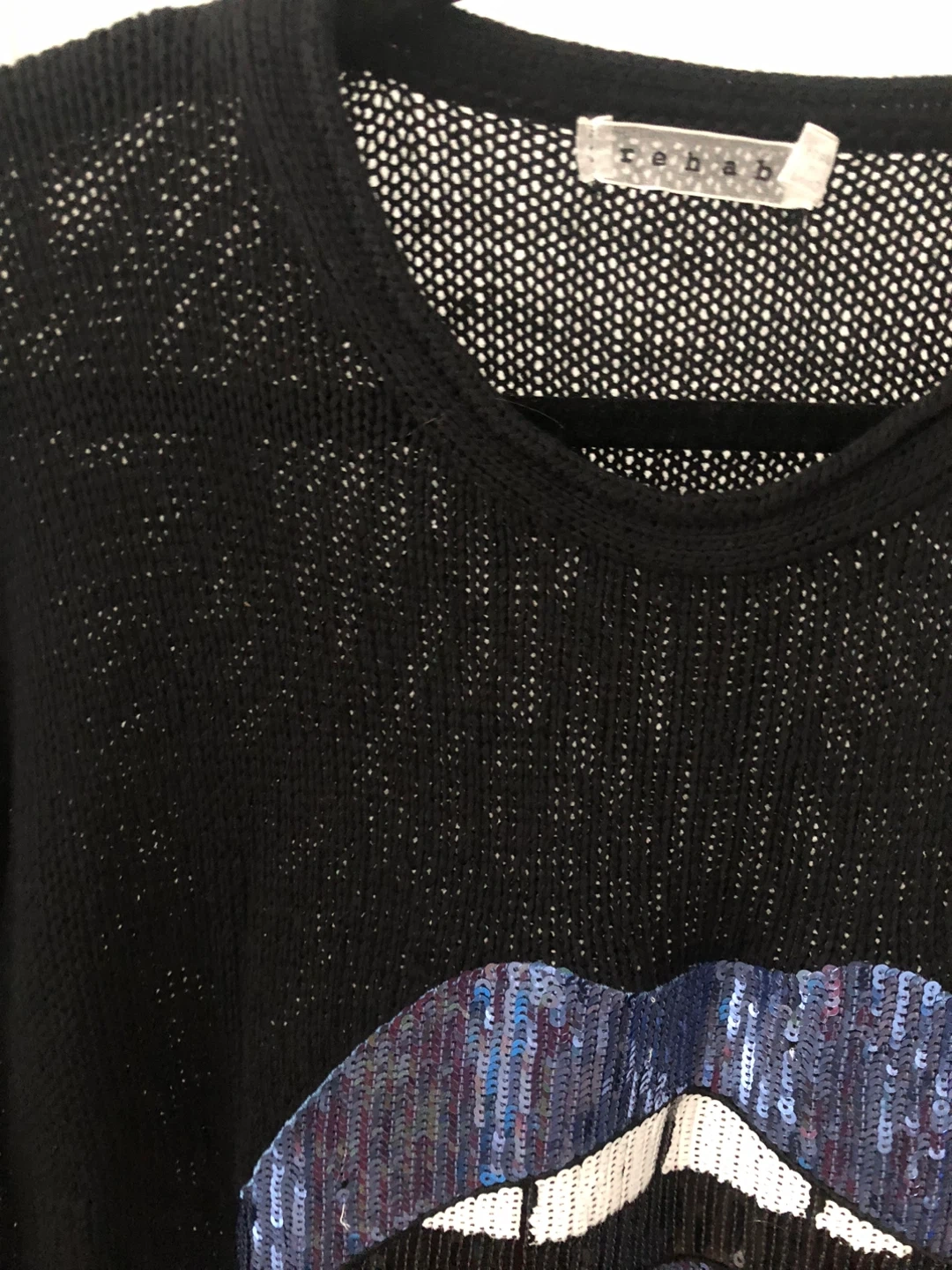 Selling a cute Rebab black sweater with a sequin lips design! It's a size small and in great condition. The material is a lightweight knit, perfect for layering.