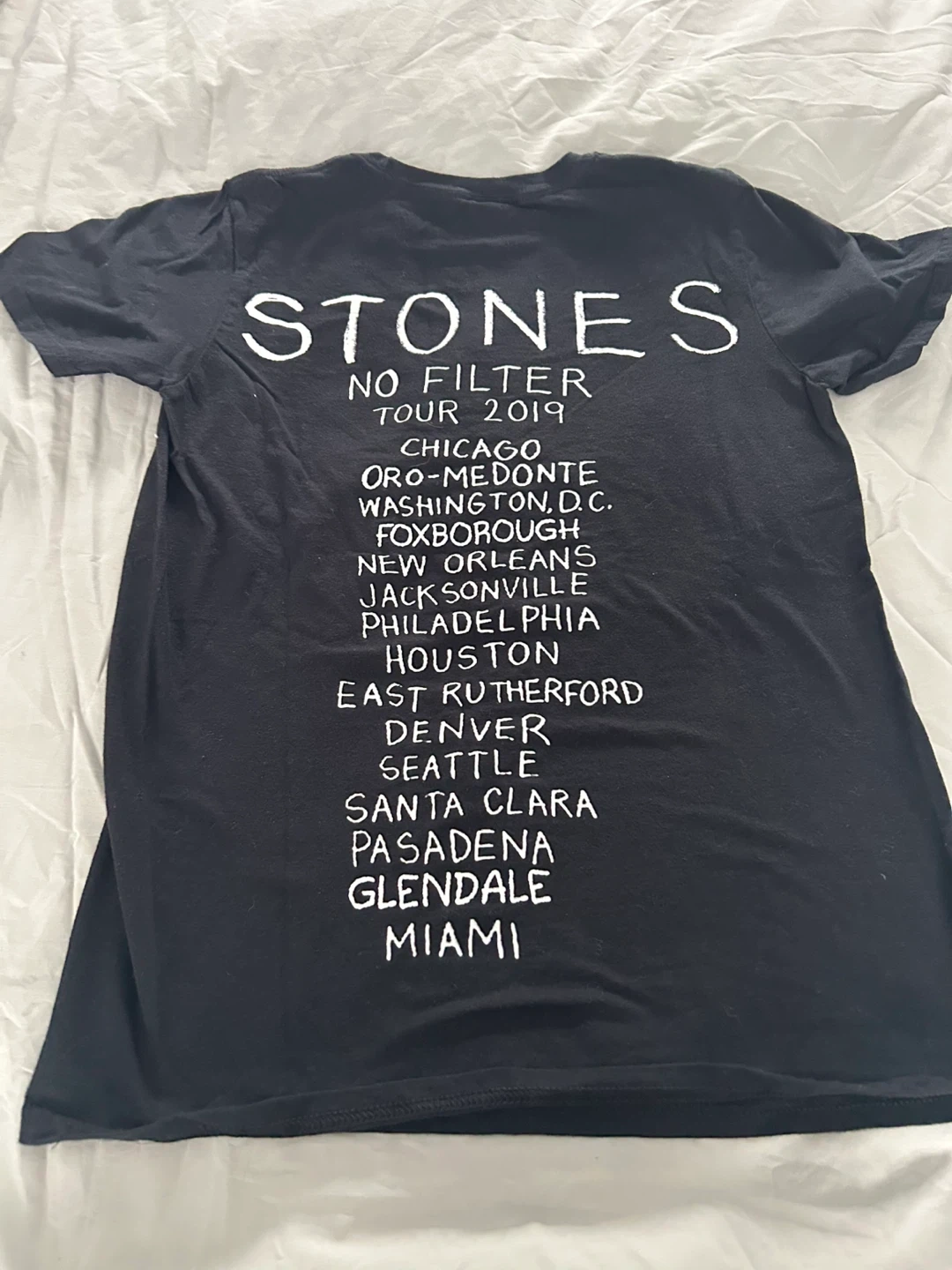 Selling a Rolling Stones No Filter Tour 2019 T-shirt in size small! The shirt is black and features the iconic Rolling Stones logo on the front, with tour locations listed on the back. It's in great condition, perfect for any fan of the band