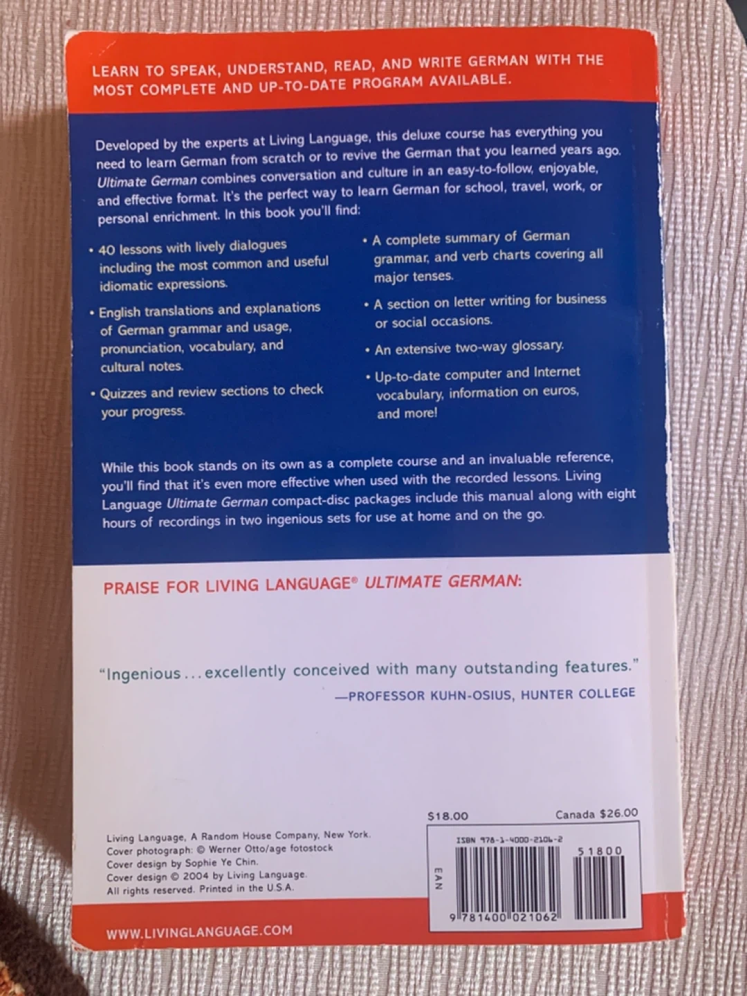 I'm selling a pre owned Living Language Ultimate German textbook. It's a complete textbook and reference guide for beginner-intermediate learners. You'll be able to speak naturally with 40 realistic dialogues using everyday language. Practice with clear grammar explanations and plenty of exercises. Discover more than language with cultural highlights on society and lifestyle