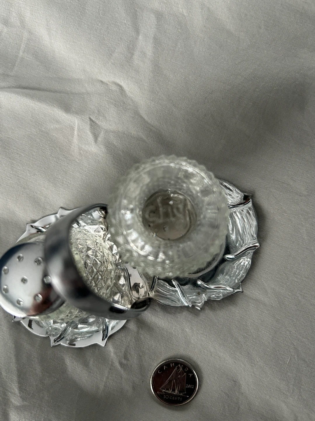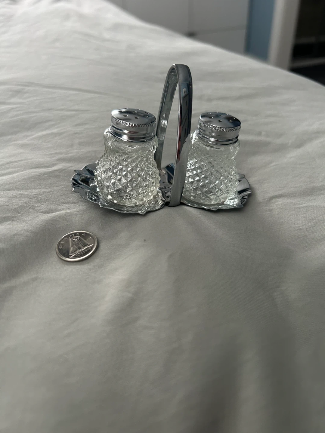 Selling a cute set of vintage salt and pepper shakers with a silver stand. They have a lovely diamond pattern on the glass and would look great on any table!