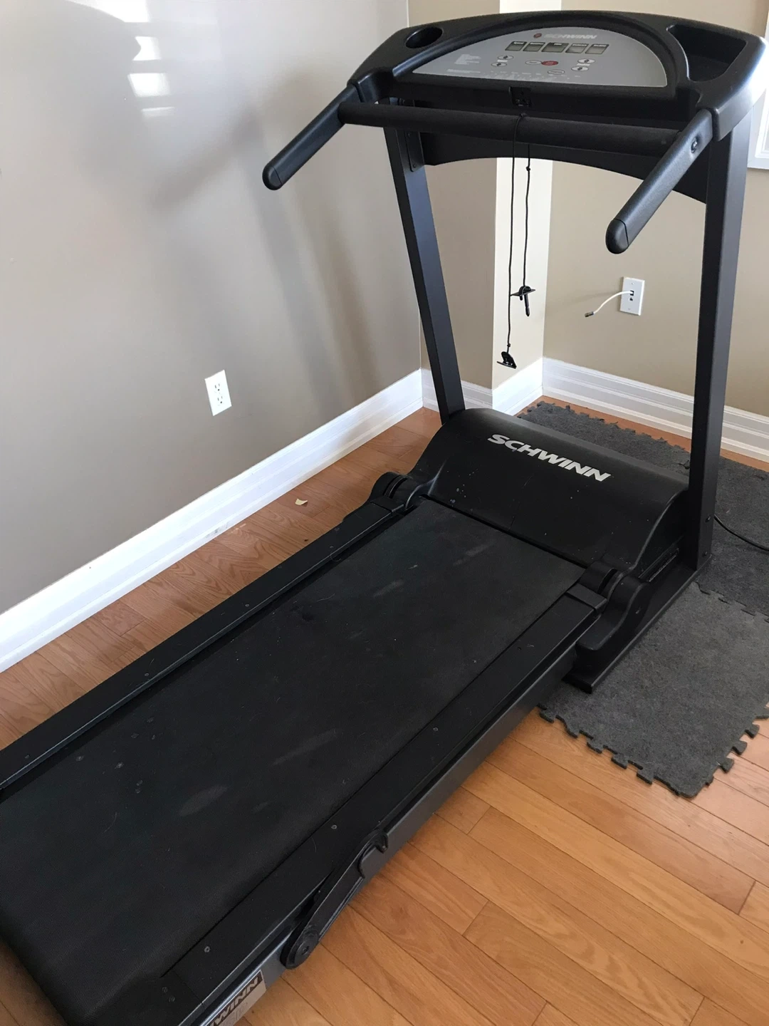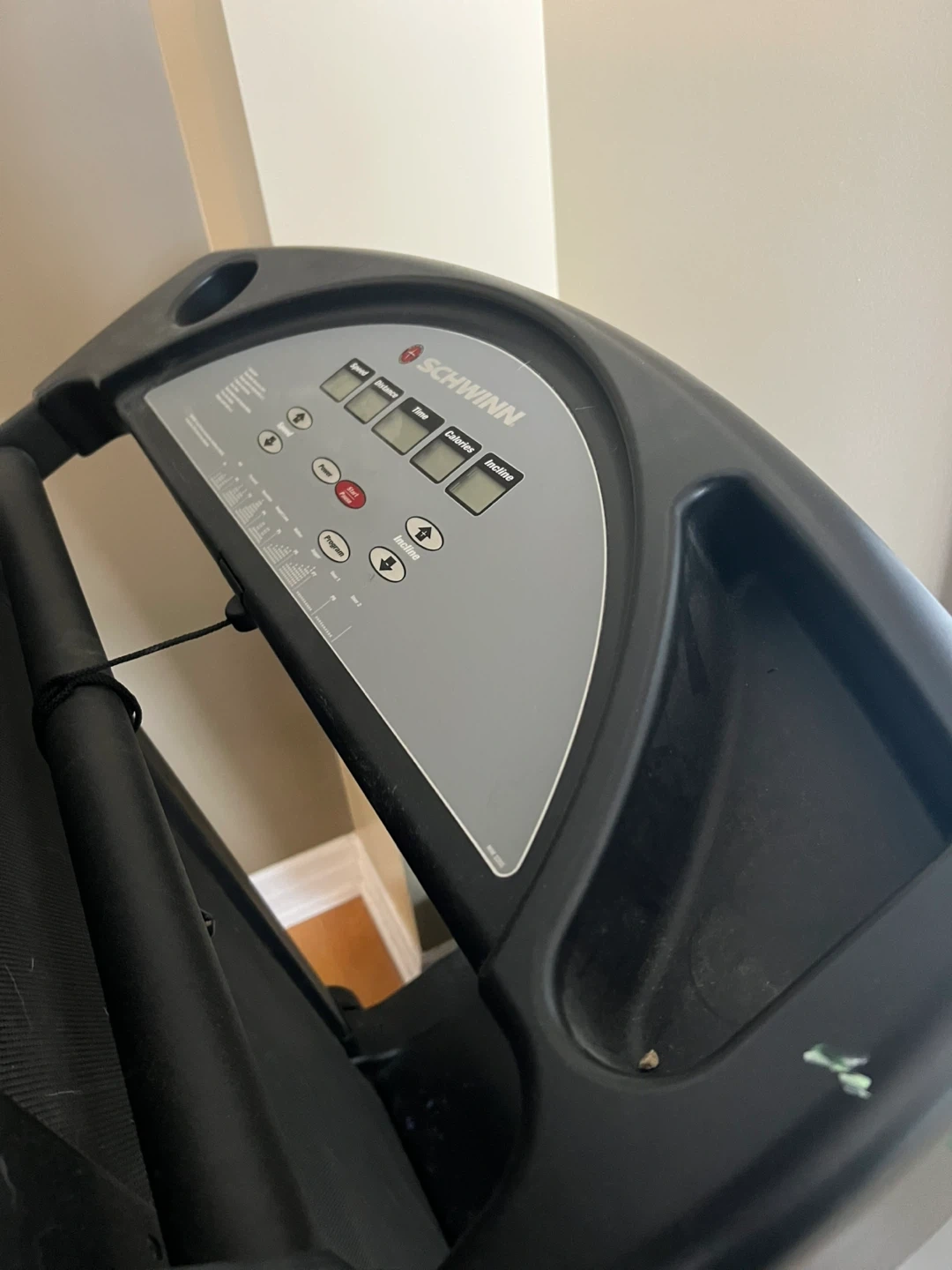 • Schwinn motorized treadmill with straightforward console buttons, speed controls, and safety key—great for beginners or anyone getting back into shape.