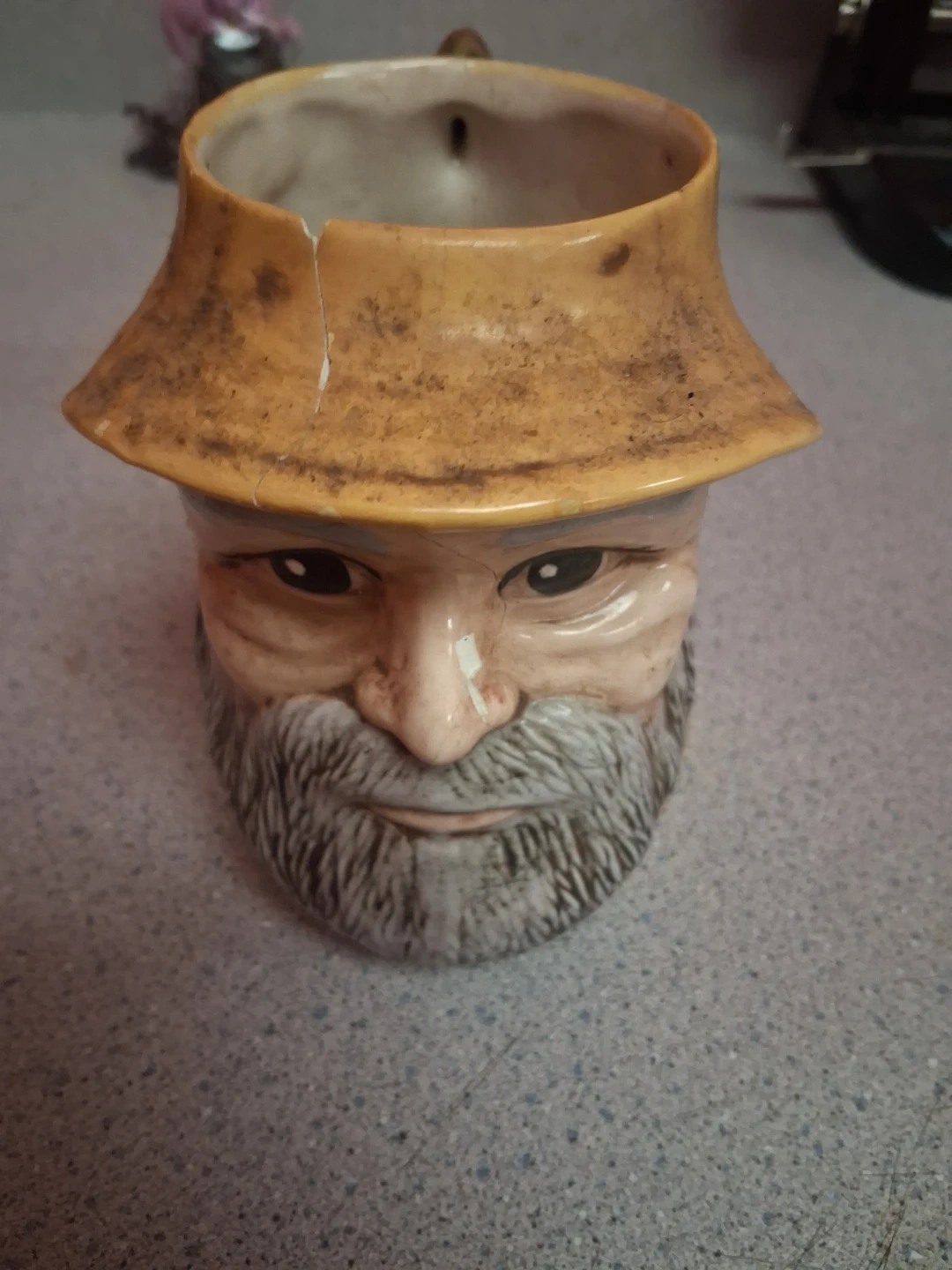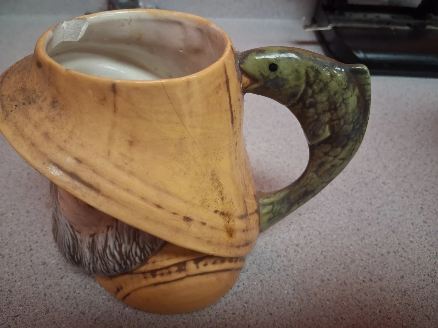 Selling a vintage fisherman mug. It has a unique design with a fisherman's face and a fish-shaped handle. There is a crack on the brim of the fisherman's hat.
