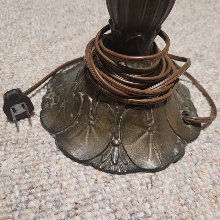Selling a vintage Tiffany style table lamp with a bronze finish. It features a decorative base and a classic design that would look great in any room especially with a stained glass shade on. It's in good condition and ready to brighten up your space!