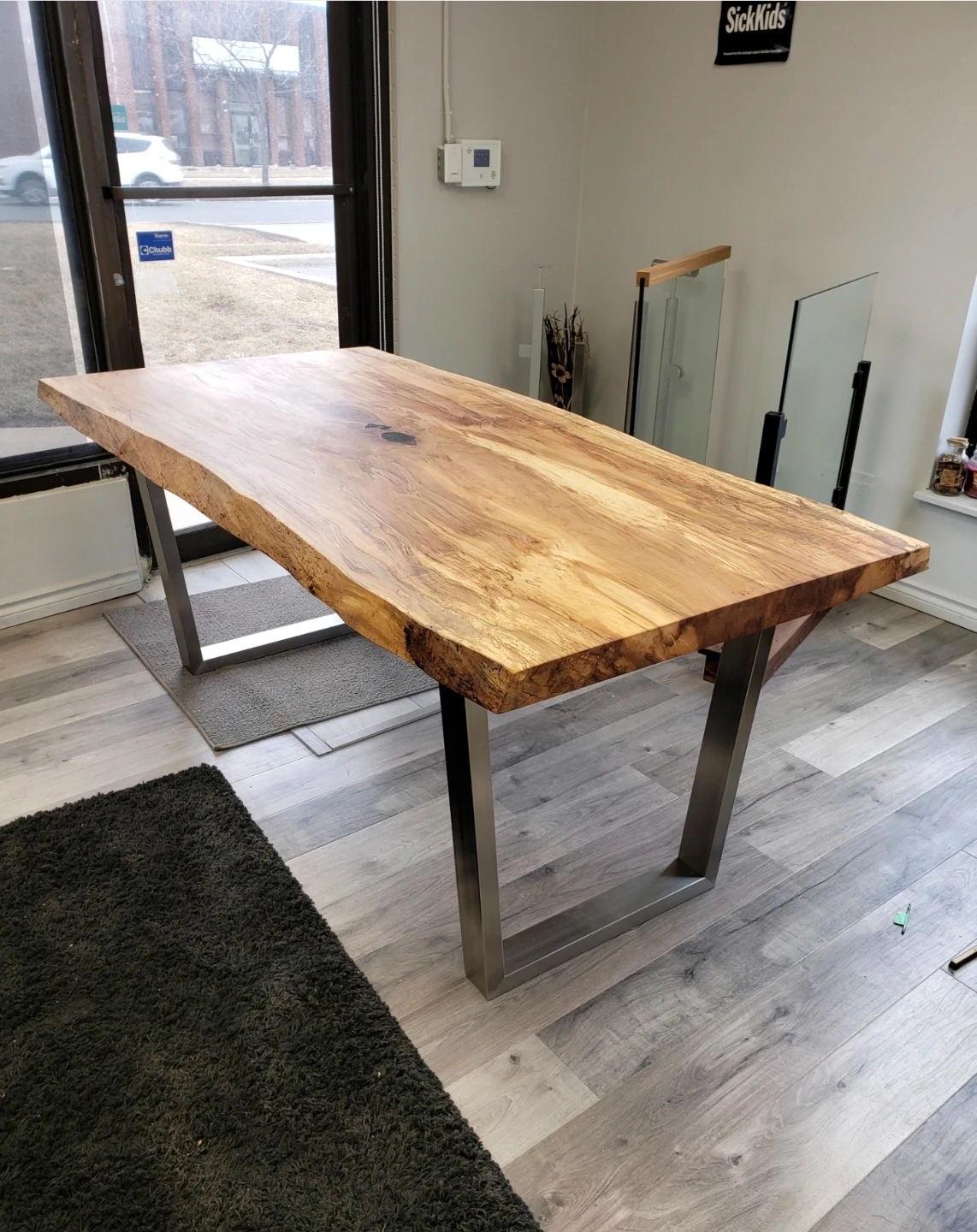 Selling a beautiful live edge wood dining table. It features a unique, natural edge and sturdy metal legs. Perfect for adding a rustic yet modern touch to your dining space! It can comfortably seat 6 people.