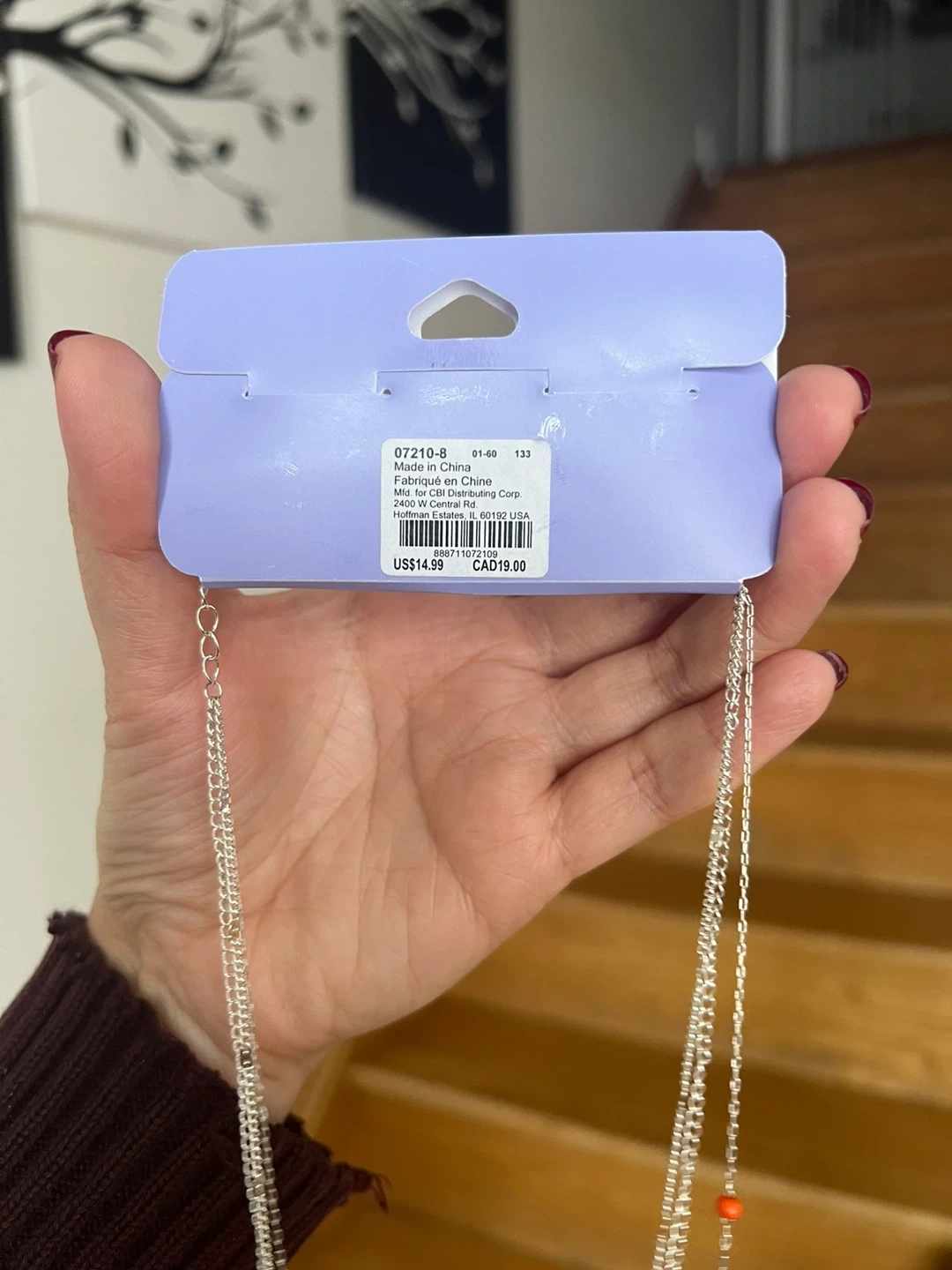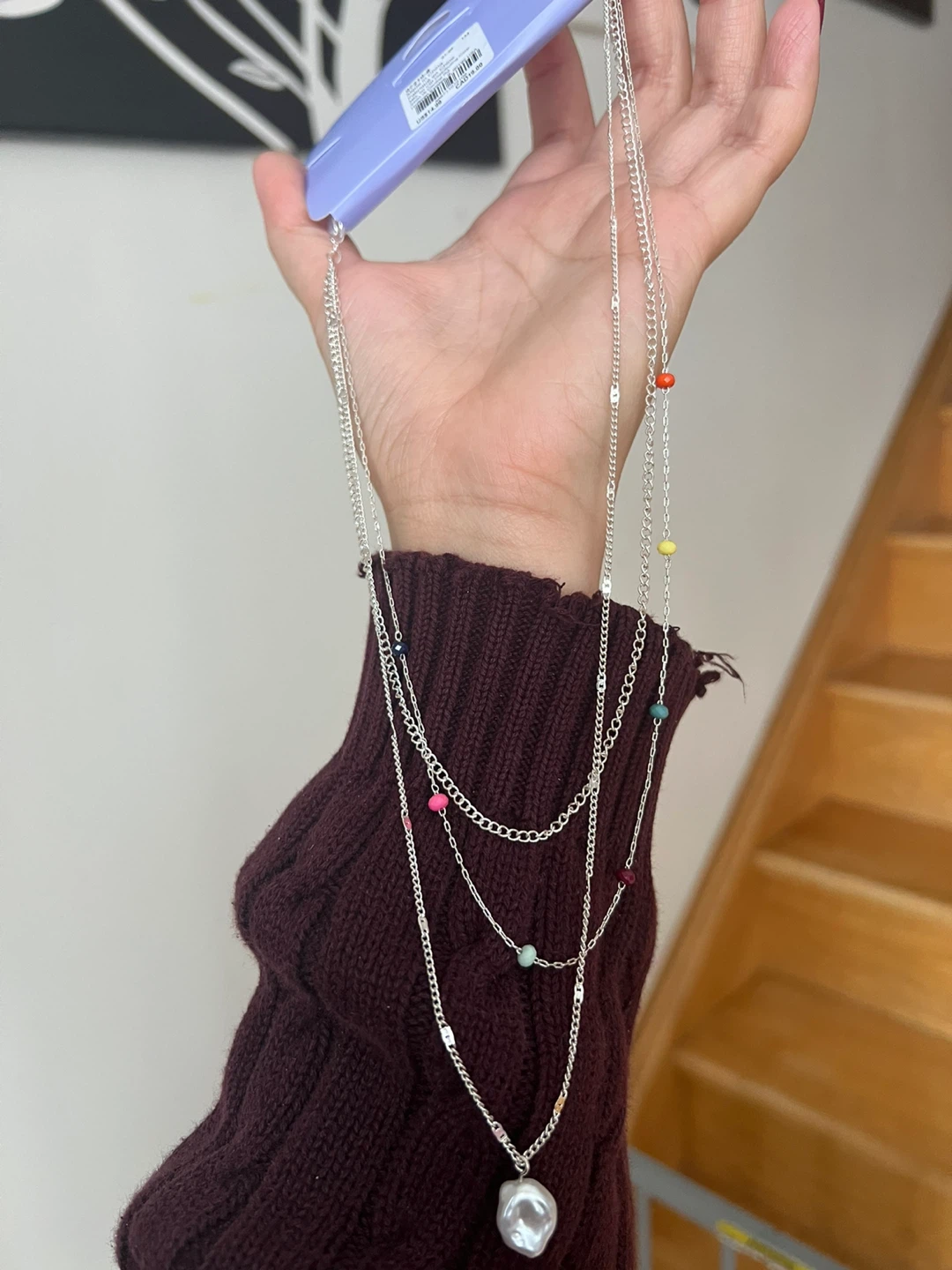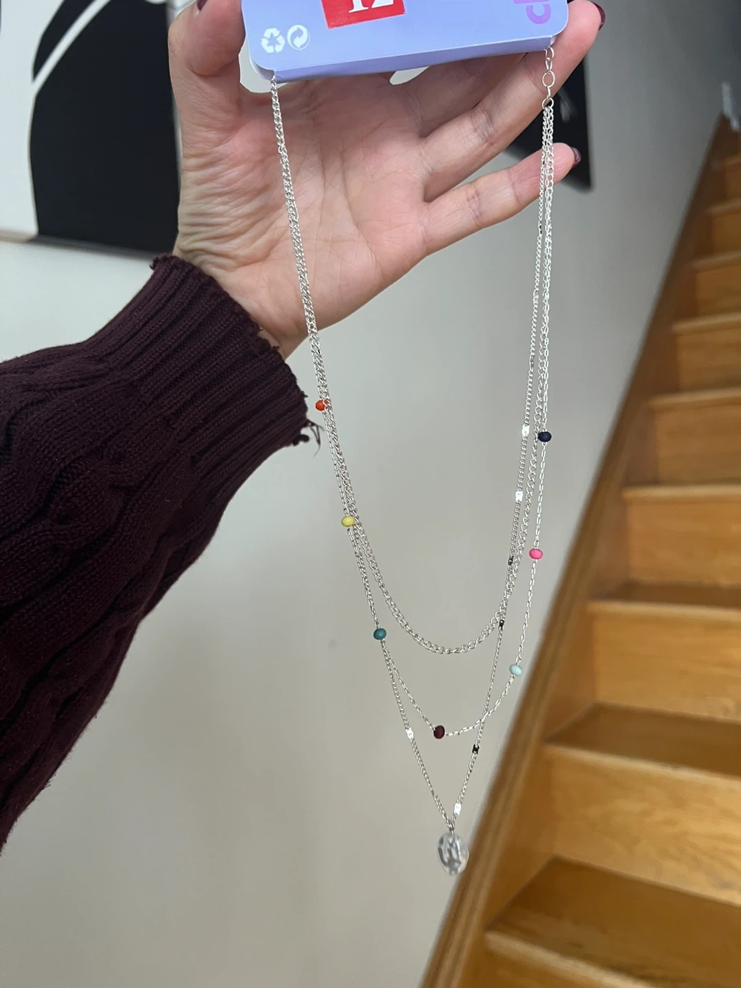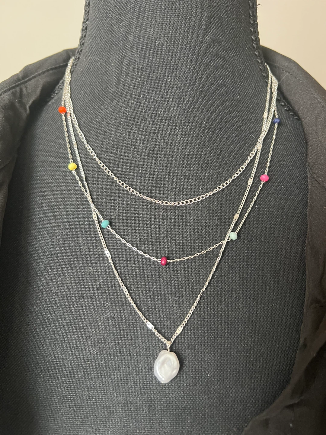 This is a brand new silver-tone layered necklace from Claire's! It features multiple delicate chains and colourful beads, finished with a faux pearl pendant. The original price on the tag is CAD $19.00