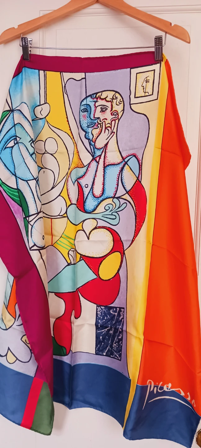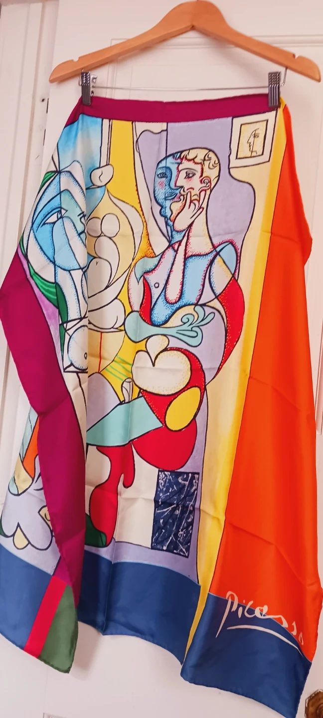 NEW !! PABLO PICCASO 100% SILK GORGEOUS LARGE VIBRANT COLORFUL SCARF. It features a colorful and abstract design, signed Picasso in the corner. The scarf is in great condition and would make a beautiful addition to any outfit or collection!! 34"×33" . ALL MY PRICES ARE NEGOTIABLE !!