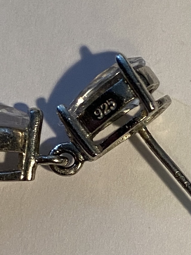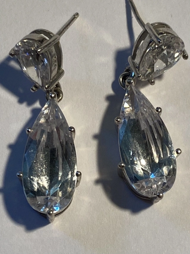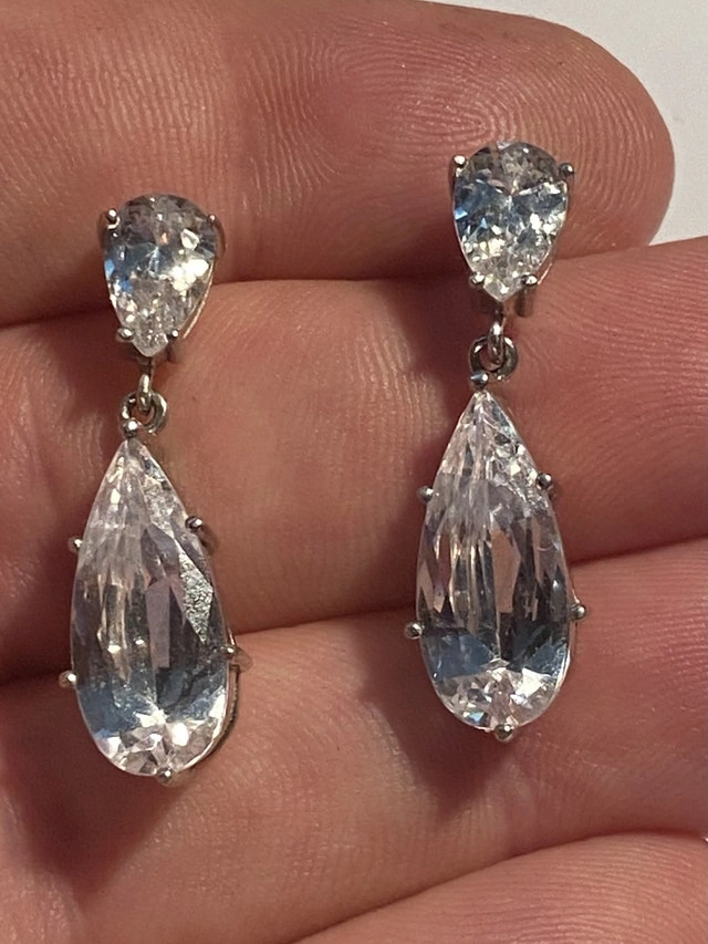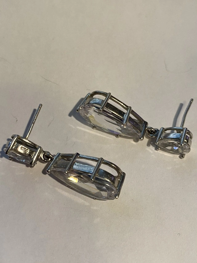 Sparkle with these elegant 925 silver drop earrings, featuring a pear-shaped cubic zirconia. These earrings are in used condition, with minor wear, but ready to add a touch of class to your look. * Metal: 925 Sterling Silver * Stone: Cubic Zirconia * Style: Drop/Dangle