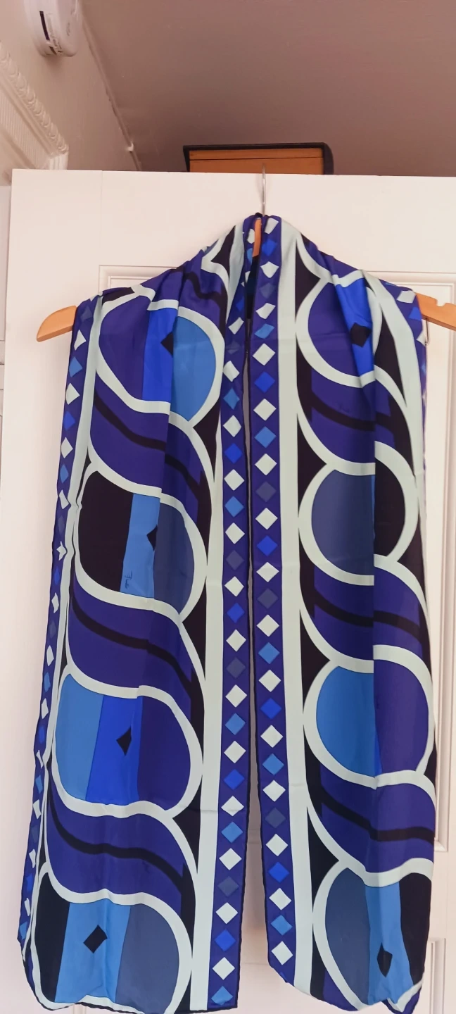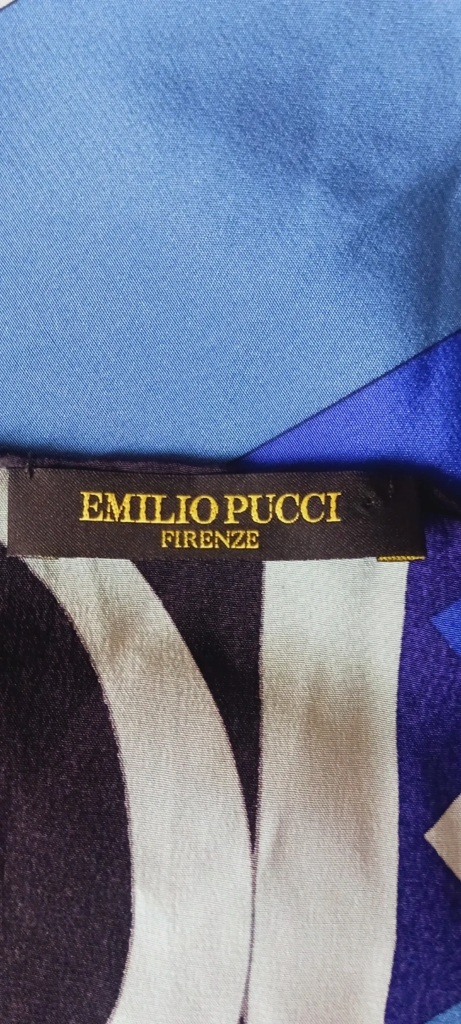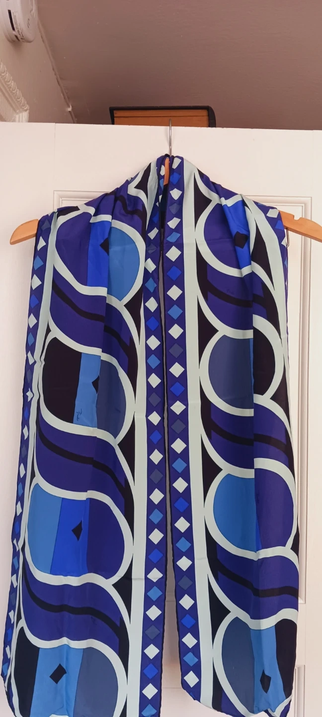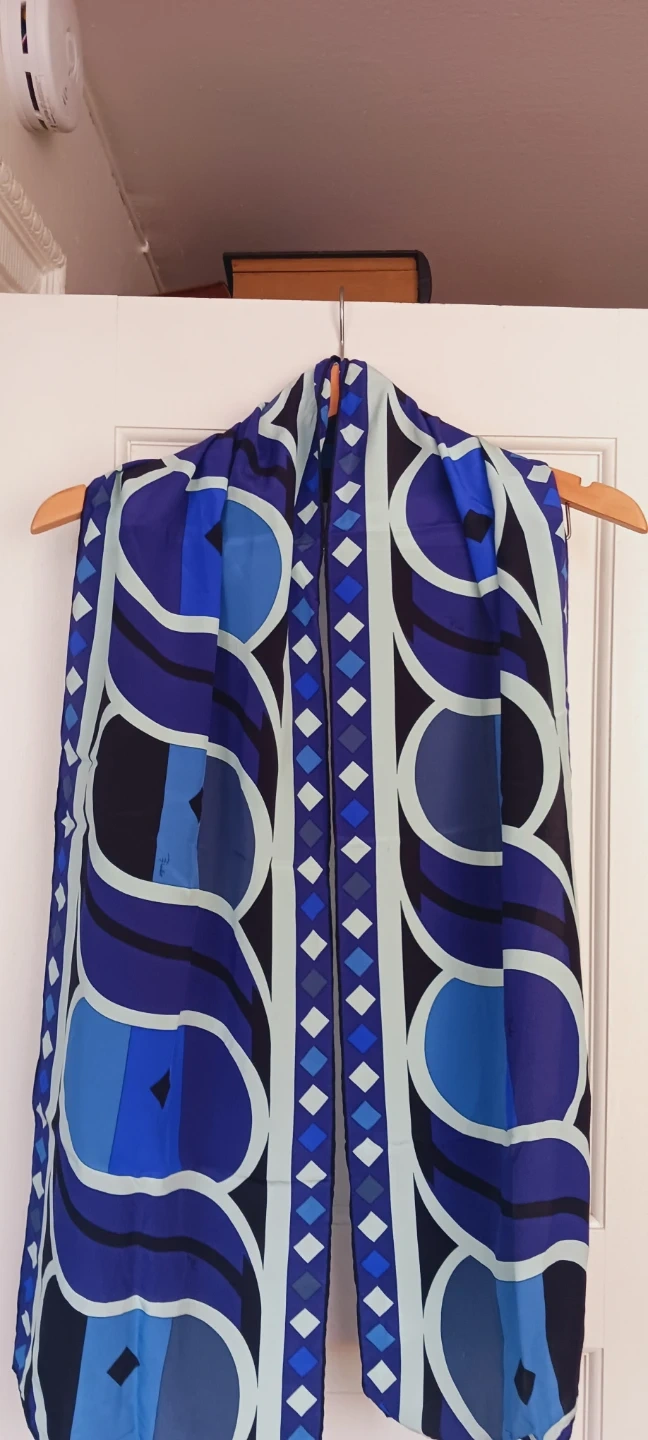 EMILIO PUCCI DESIGNER SIGNED AUTHENTIC GORGEOUS SILK SCARF WITH A STRIKING BLUE PATTERN It's in excellent Mint condition and ready to add a touch of elegance to your wardrobe!! Perfect Christmas 🎄 Holiday 🎁 Gift !!! Made in Italy. It is authentic signed EMILIO PUCCI . 66"×12".
