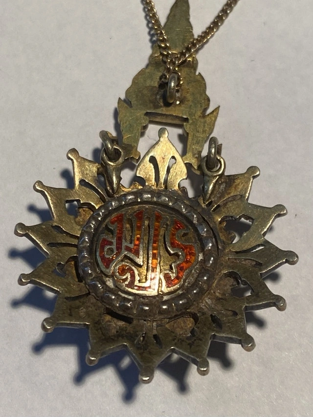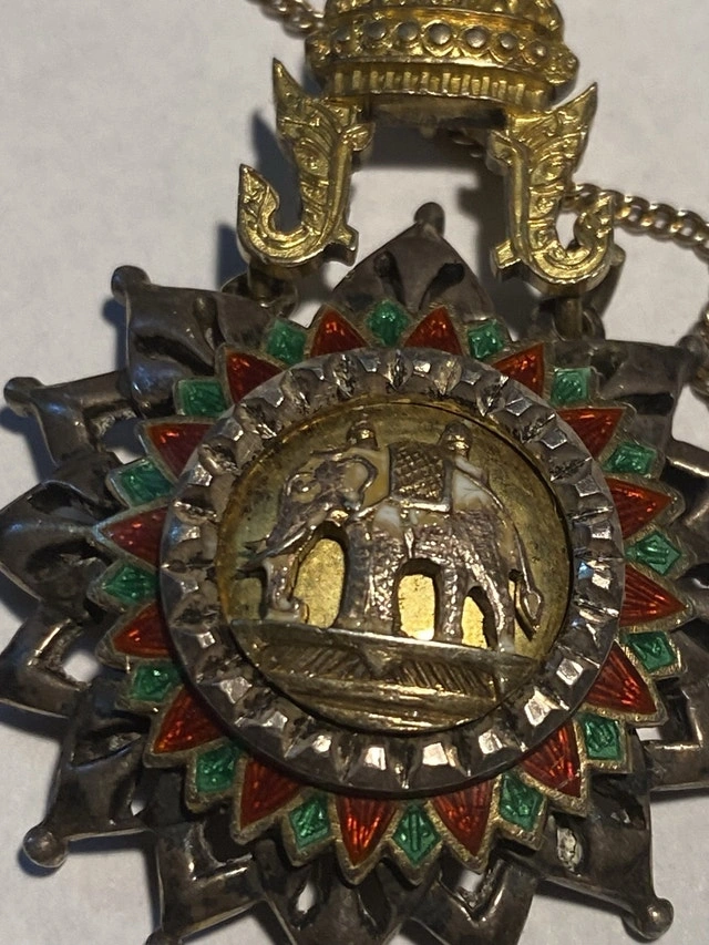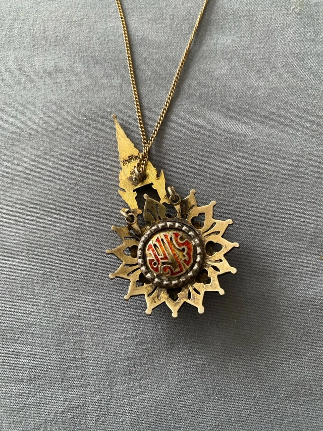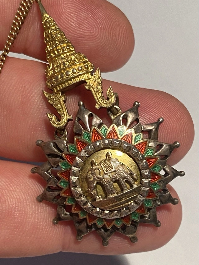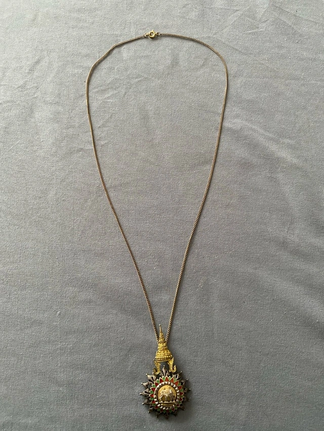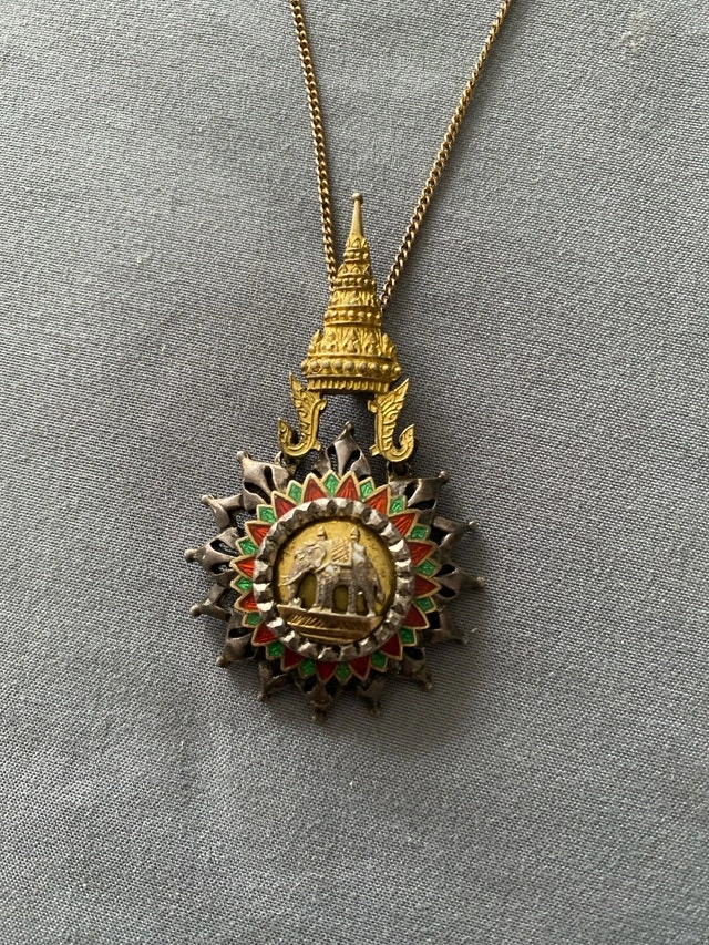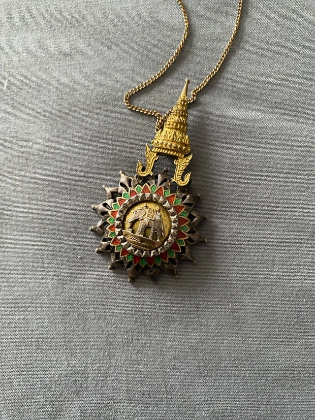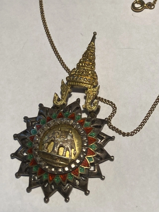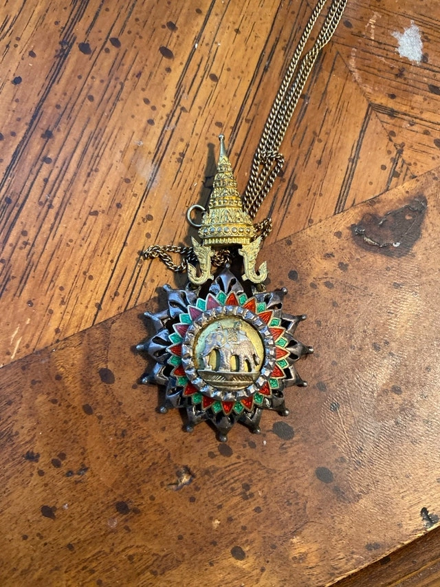 This is a unique vintage-style pendant necklace, showcasing an intricate hinge style elephant design with colourful enamel accents. Because this is not a new item, there are minor signs of wear that add to its vintage charm.