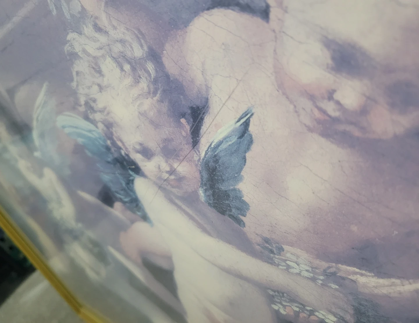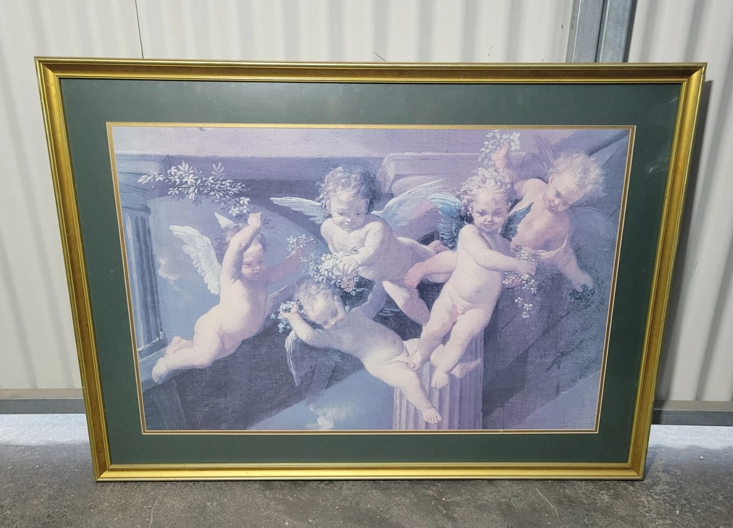 I'm selling a framed art print featuring cherubs. It has a gold-tone frame and a serene, classic design. Perfect for adding a touch of elegance to any room!