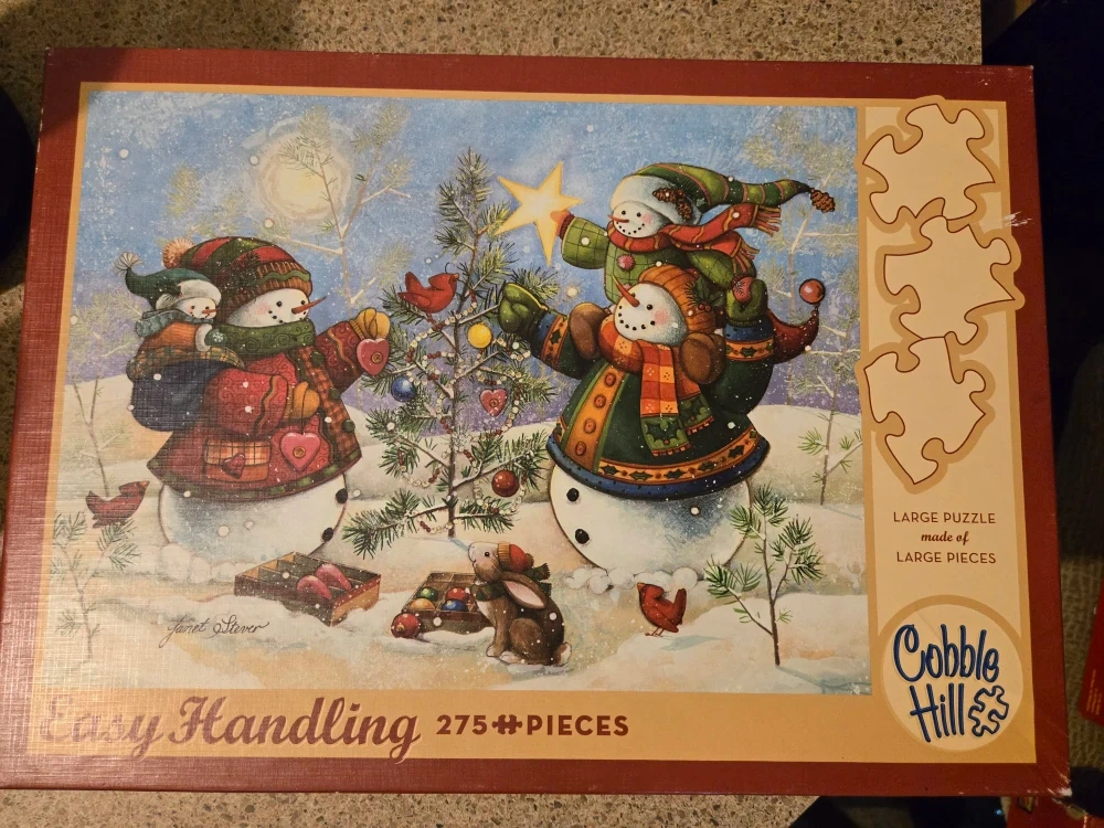 Selling a Cobble Hill 'Easy Handling' puzzle with 275 pieces! It's a large puzzle made of large pieces, perfect for easy handling. The design features a charming winter scene with snowmen decorating a Christmas tree.