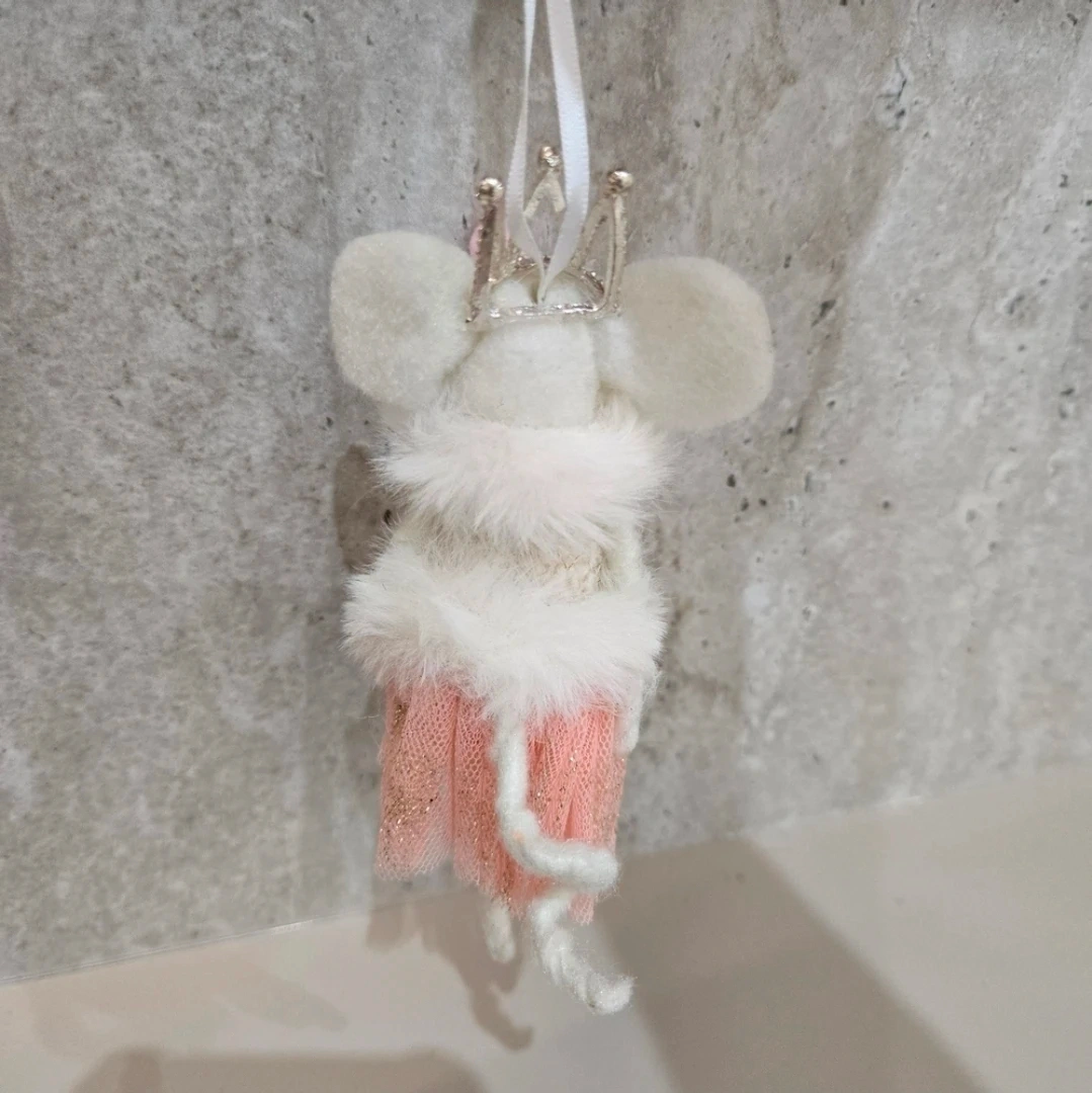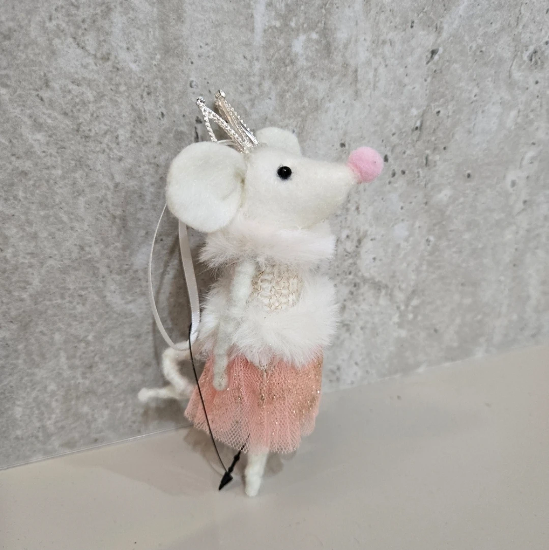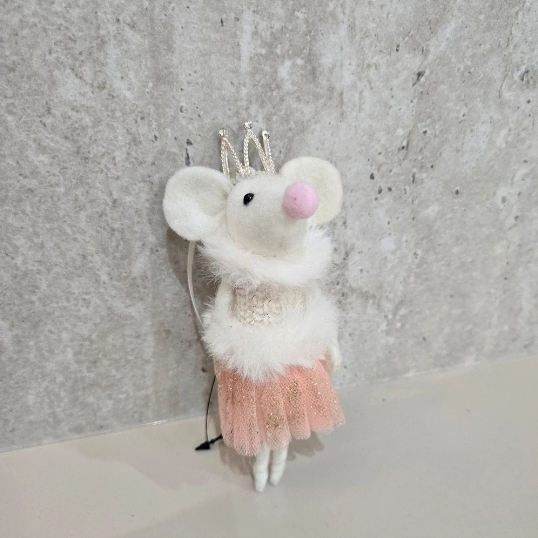 White Felted adorable mouse ornament is ready to add a touch of whimsy to your Christmas tree! It features a sweet little mouse wearing a crown and a pink tutu. Perfect for adding a bit of charm to your holiday decor