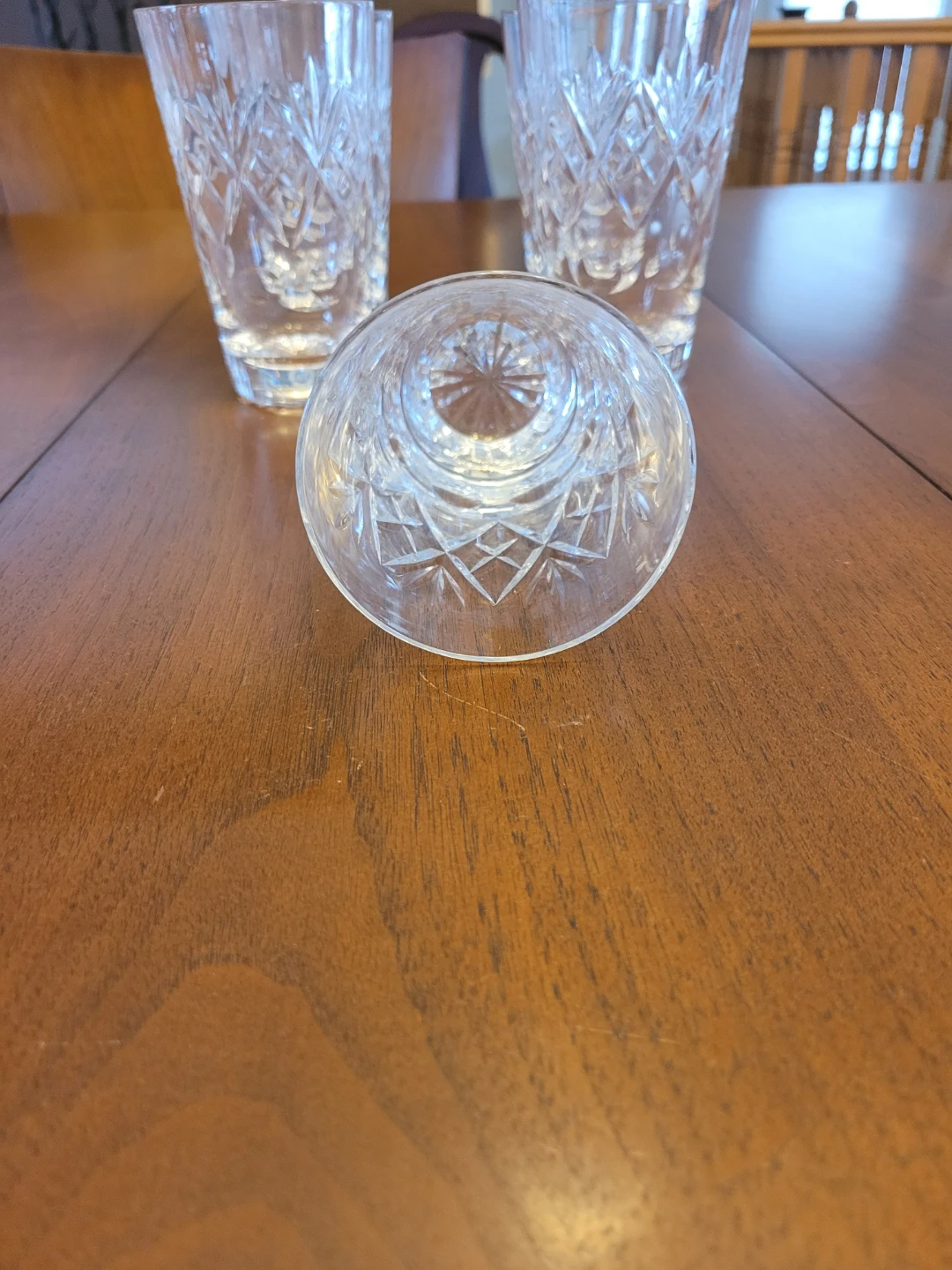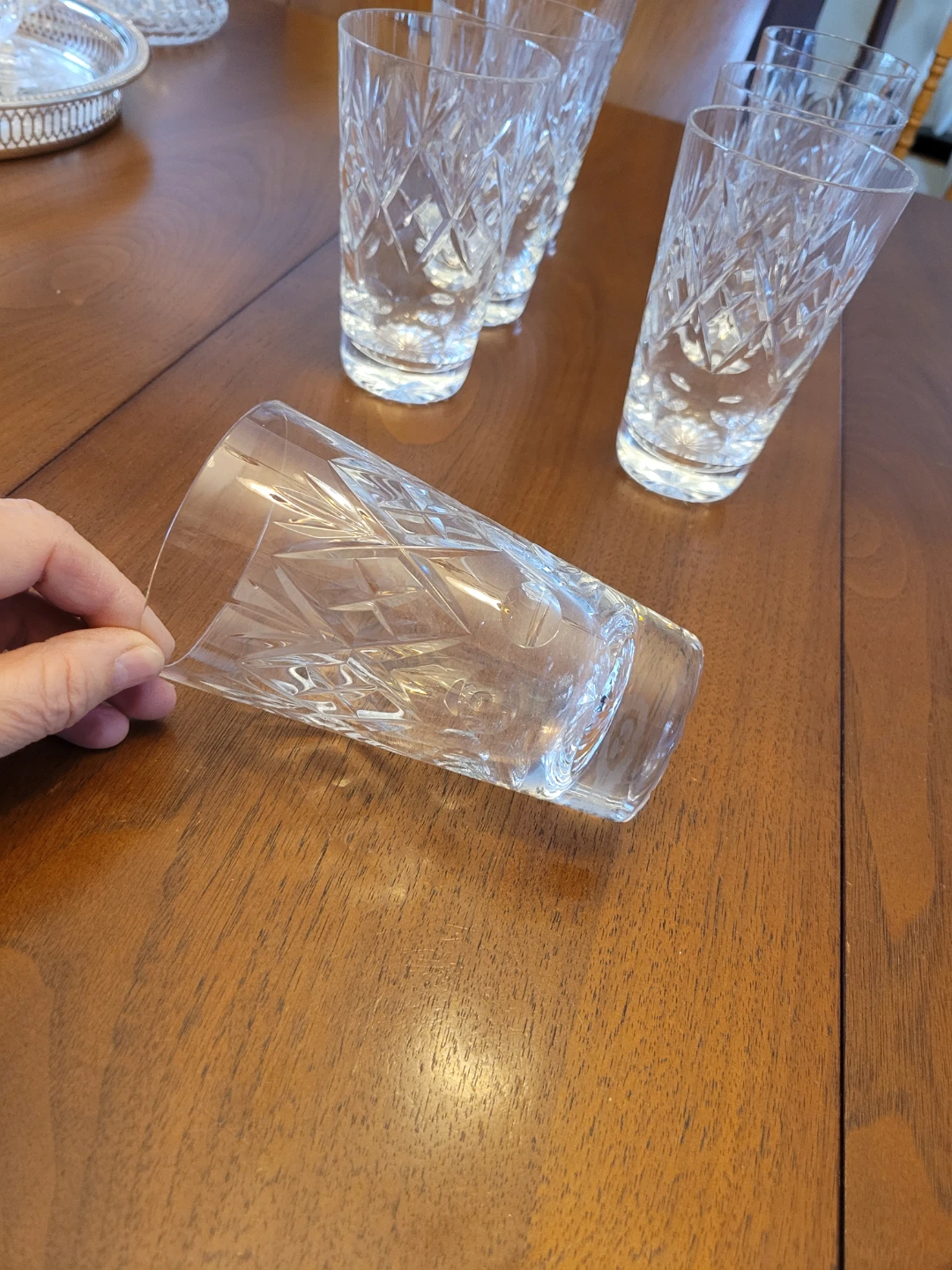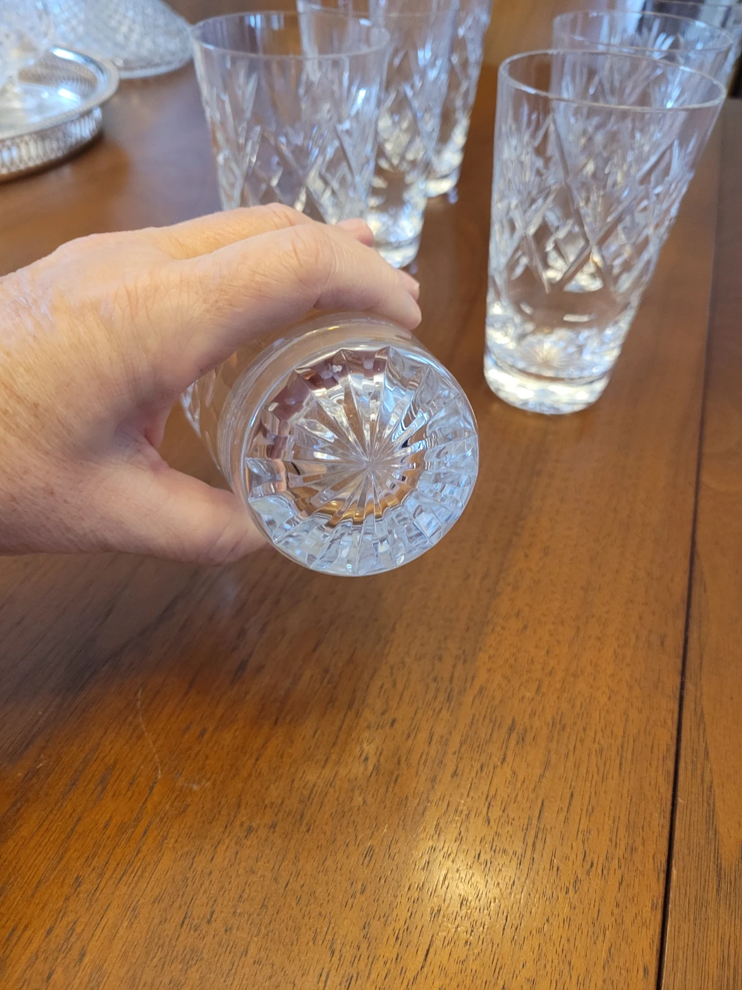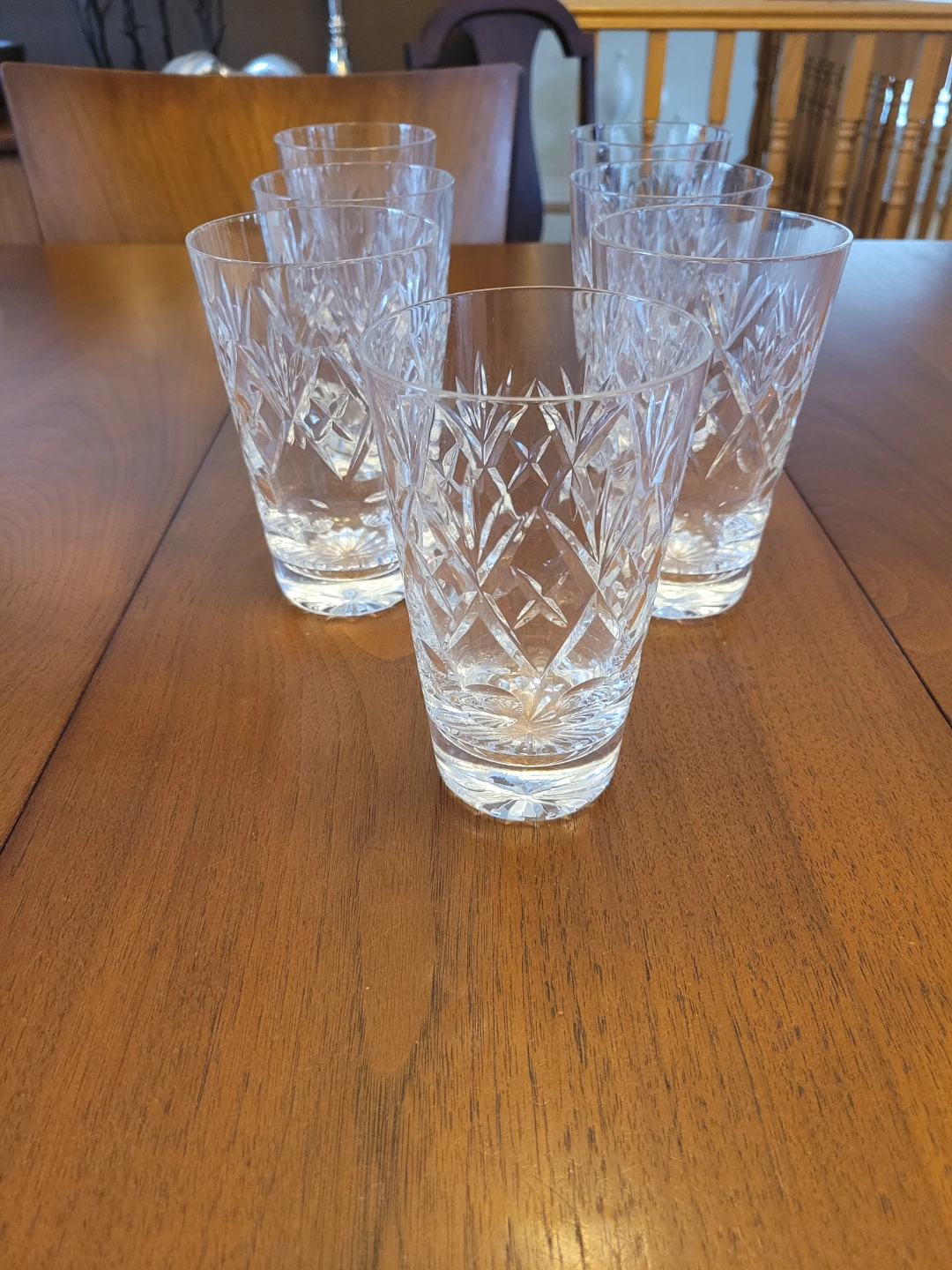 Vintage Webb Corbett set of 7 beautiful diamond-cut crystal glasses. They're in excellent condition, no chips, cracks etc. Would look lovely in any home. Perfect for everyday use water, juice, tall G&T's or on special occasions!