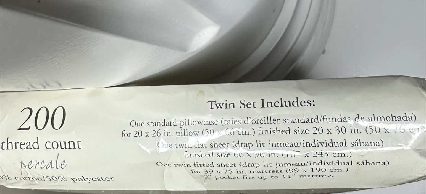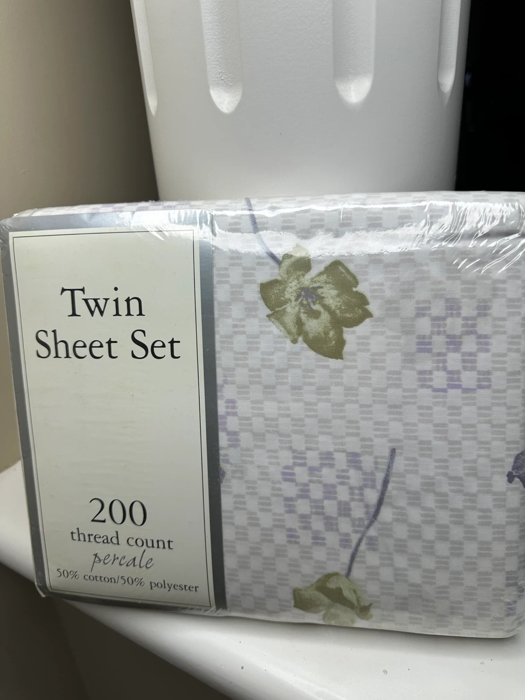 Selling a brand new twin sheet set, still in its original packaging! The set includes one standard pillowcase, one fitted sheet, and one flat sheet. It features a 200 thread count percale and is made of 50% cotton and 50% polyester. The fitted sheet fits up to an 11" mattress