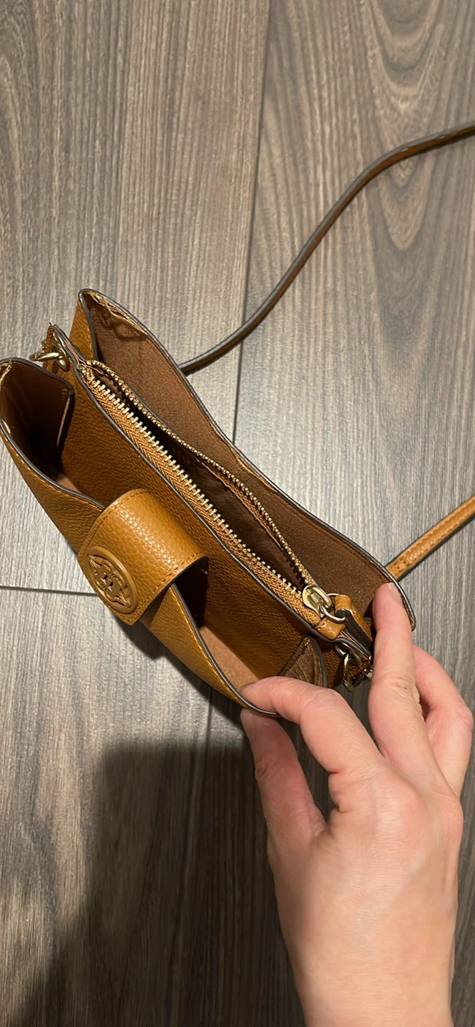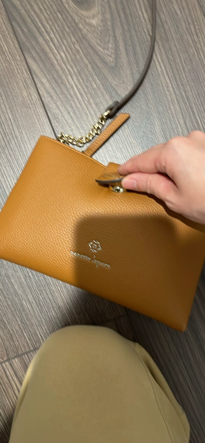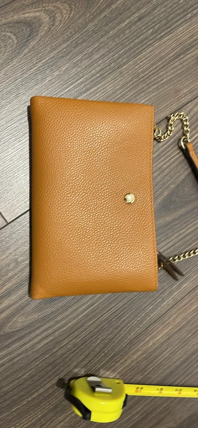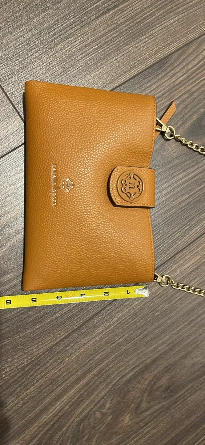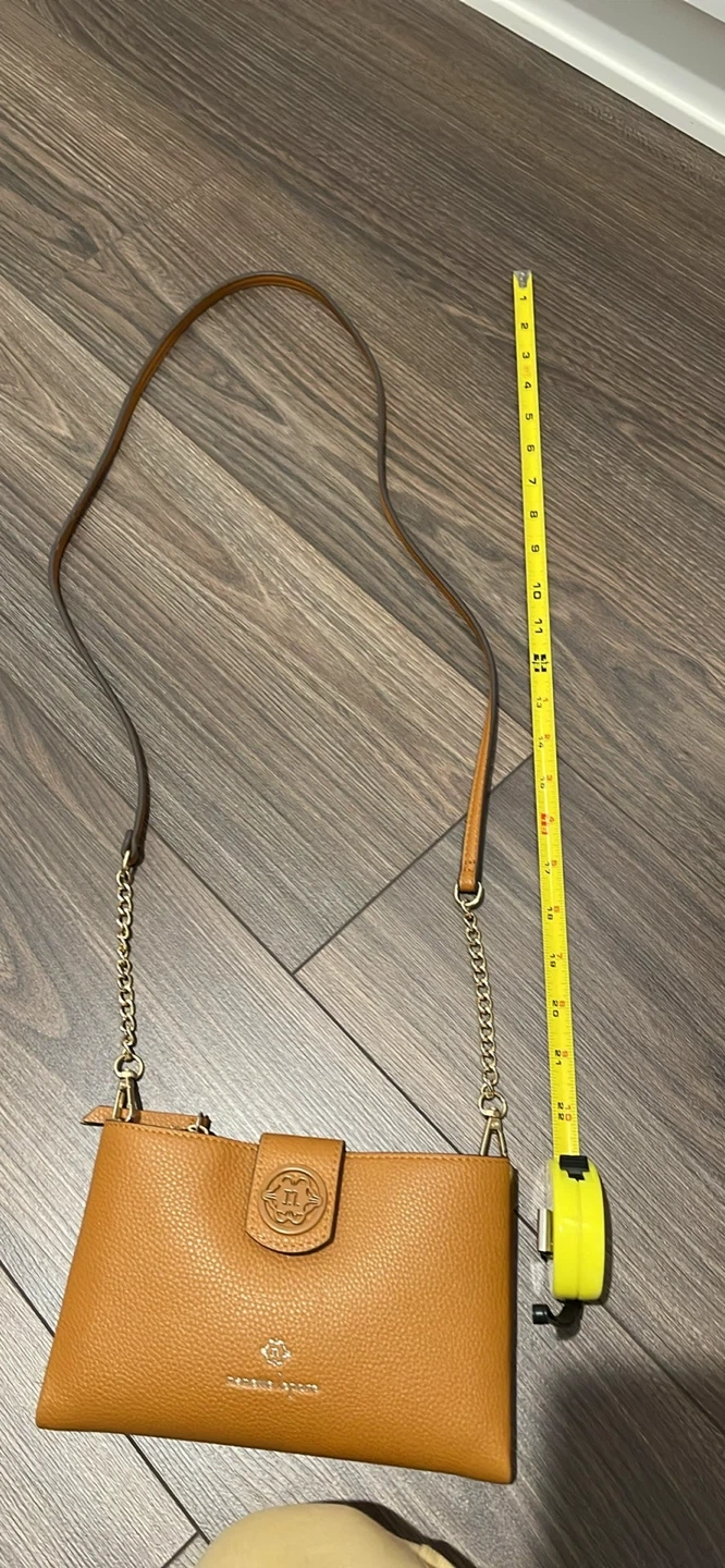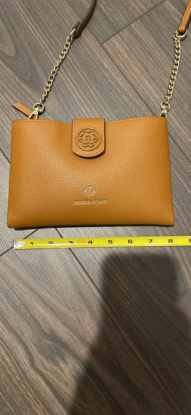 Selling a Nanette Lapore crossbody bag in a lovely caramel colour. It's made of faux leather and has a chain strap. The bag is approximately 8 inches wide and 6 inches tall. It's in great condition!