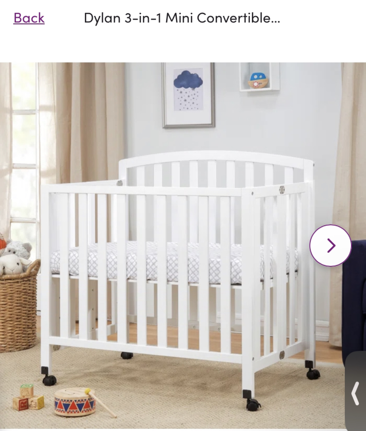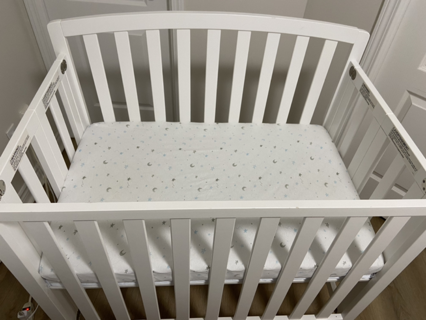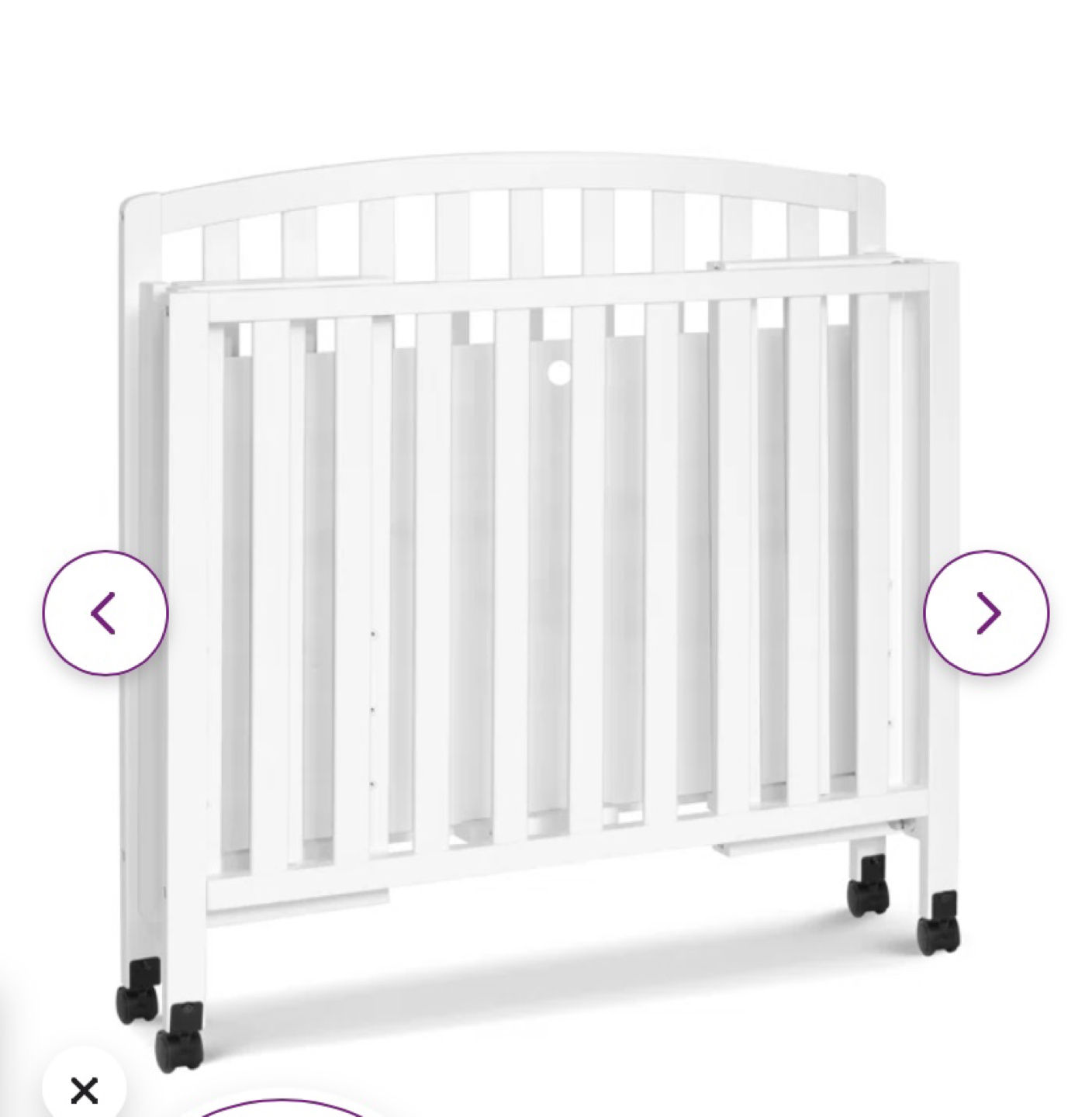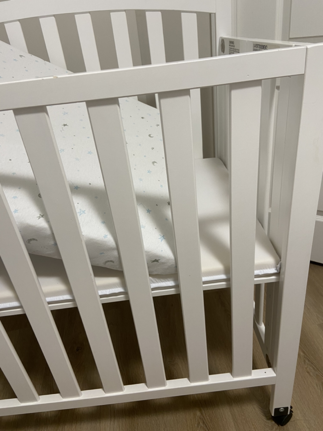 482Great for small spaces and very sturdy, wheels easily for easy transport. Included mattress cover, Dream On Me mattress.
