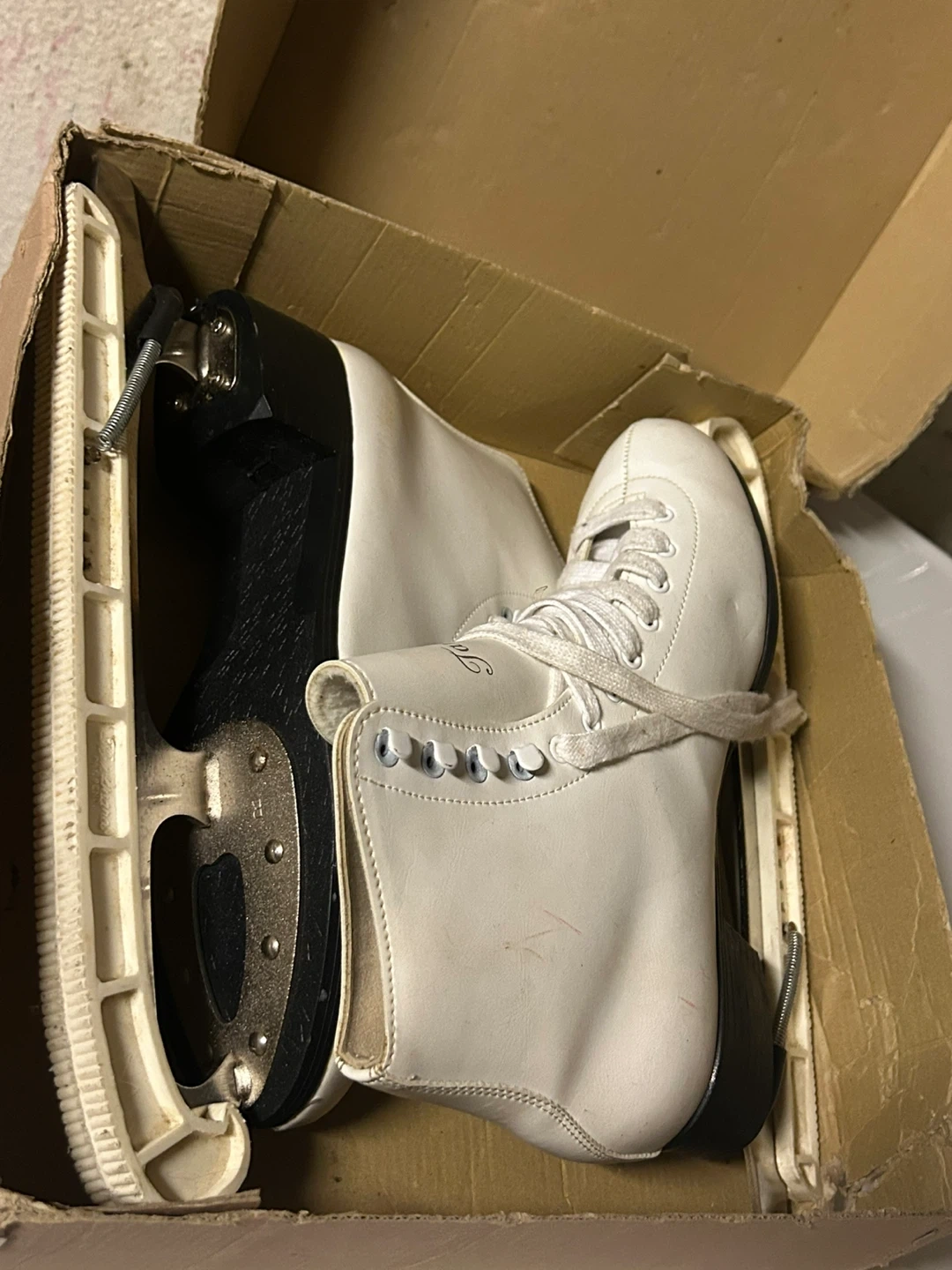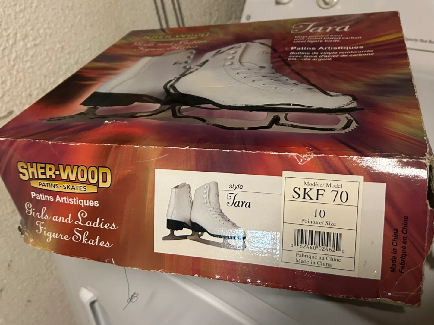 Selling a pair of Sher-Wood Tara figure skates in a size 10. They come in the original box. Great for girls and ladies who are looking to glide on the ice!