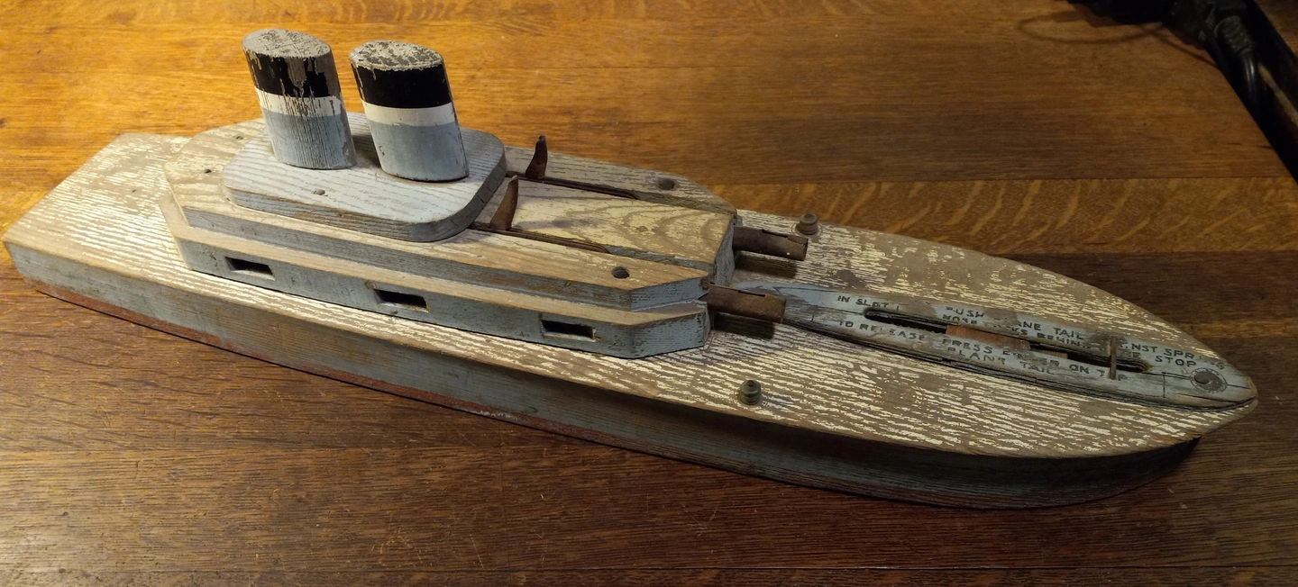 Old (antique) wood children's ship toy. Retains much of it's original paint despite it's age.