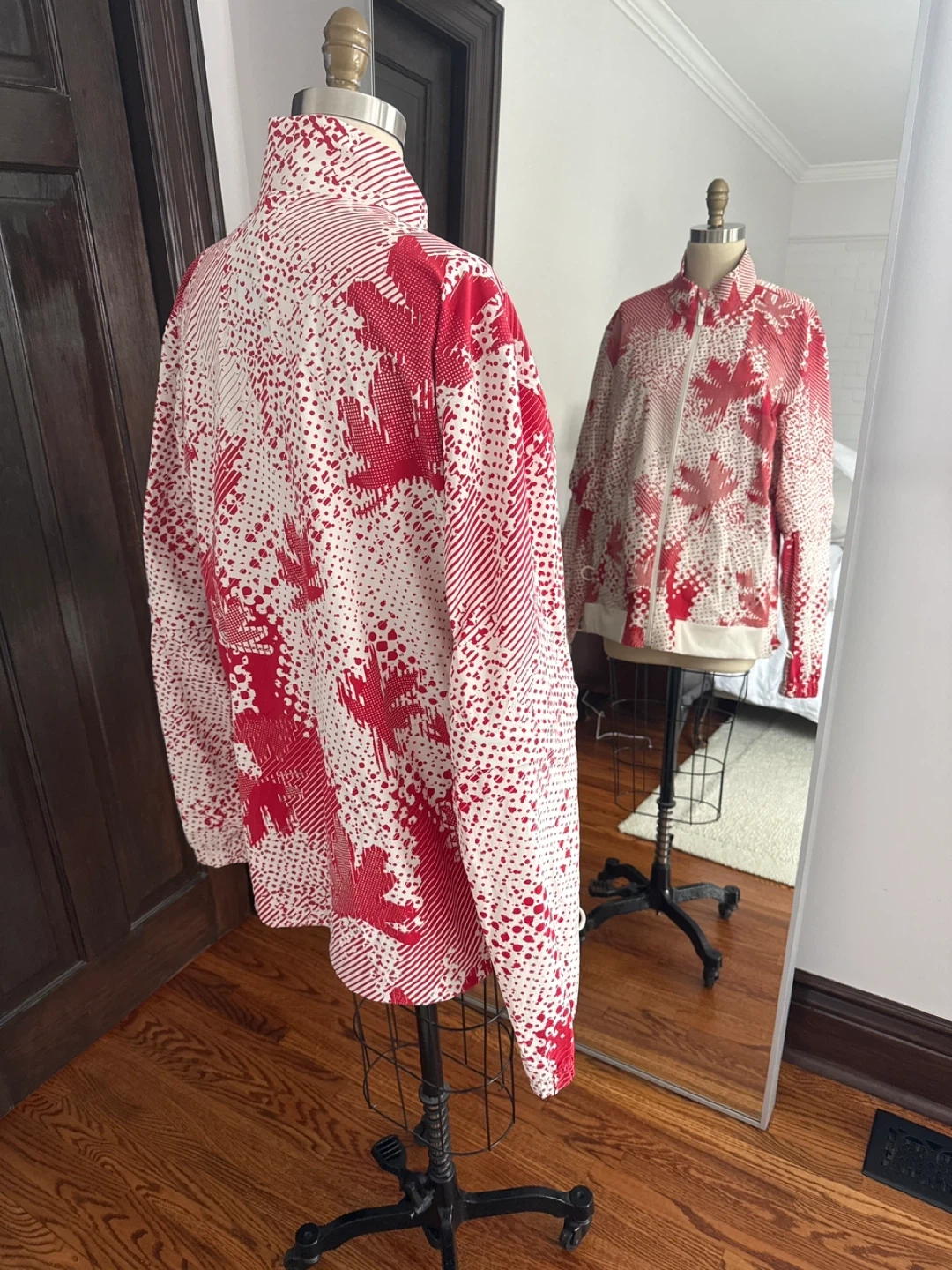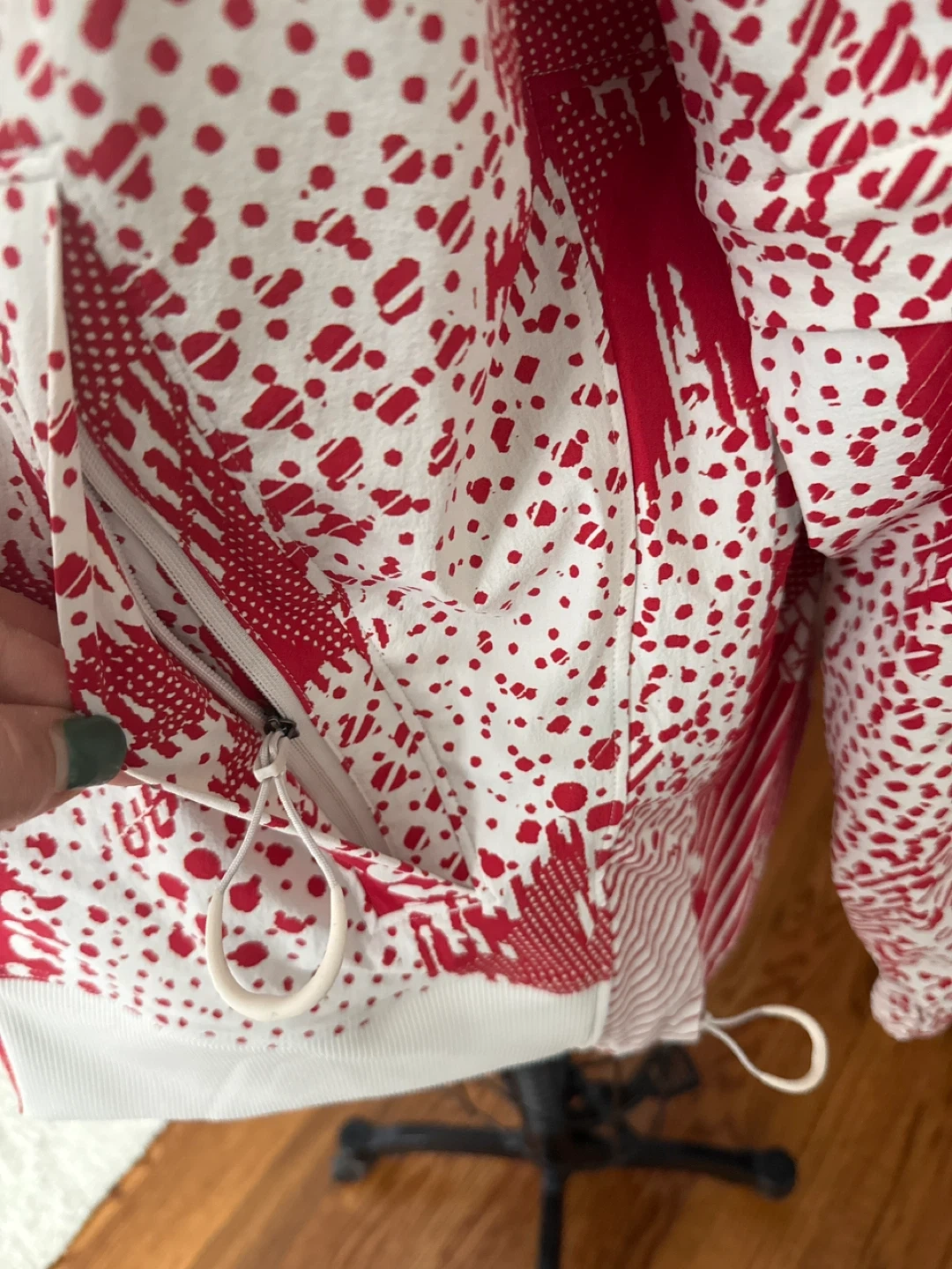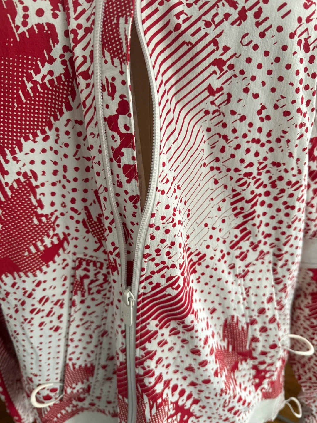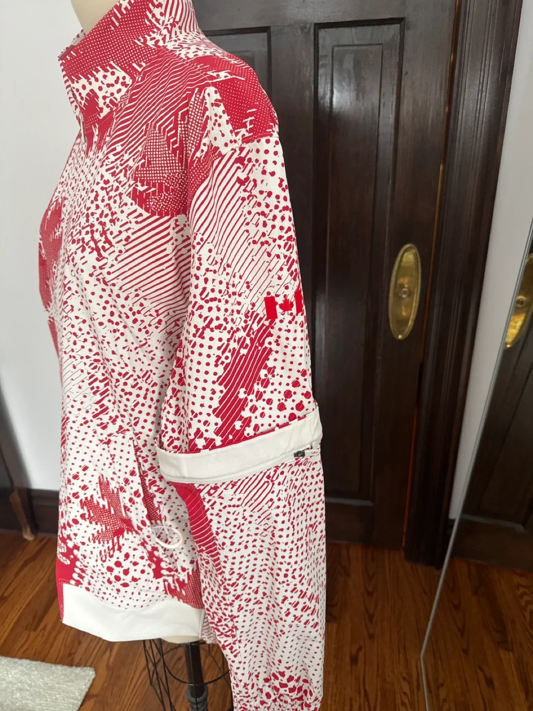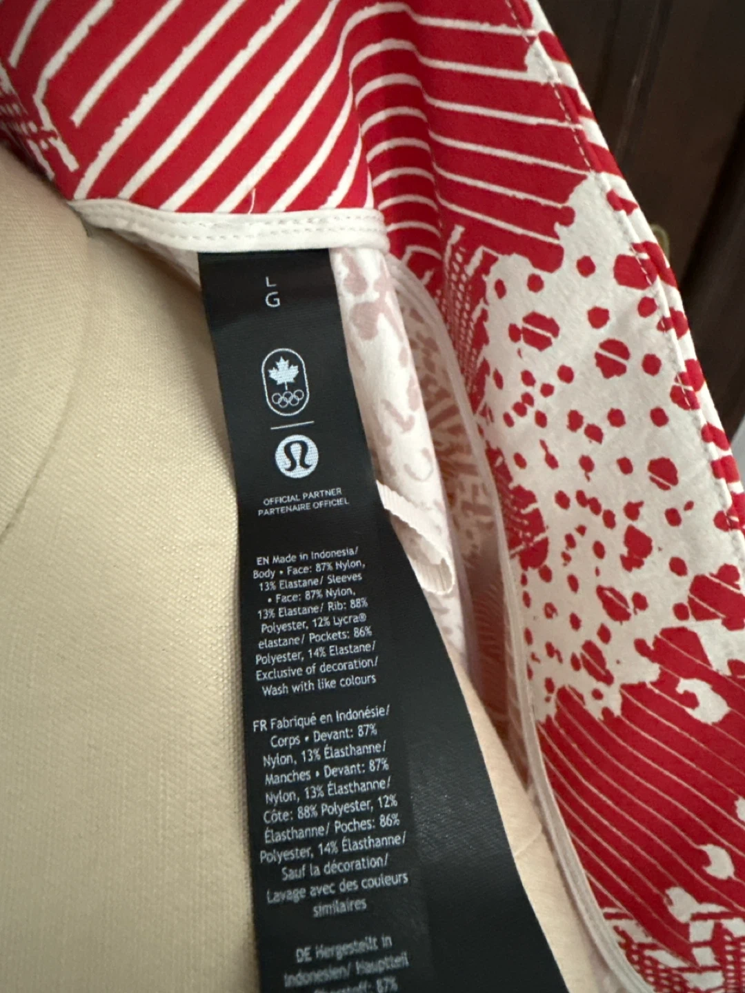 Lululemon jacket in a striking red and white pattern and the official 2024 Summer Olympics athlete uniform. It's brand new, never been worn and ready for a new owner. It has removable half sleeves Perfect for layering or wearing on its own. It’s lightweight but also warm if layered. Retailed for over $350