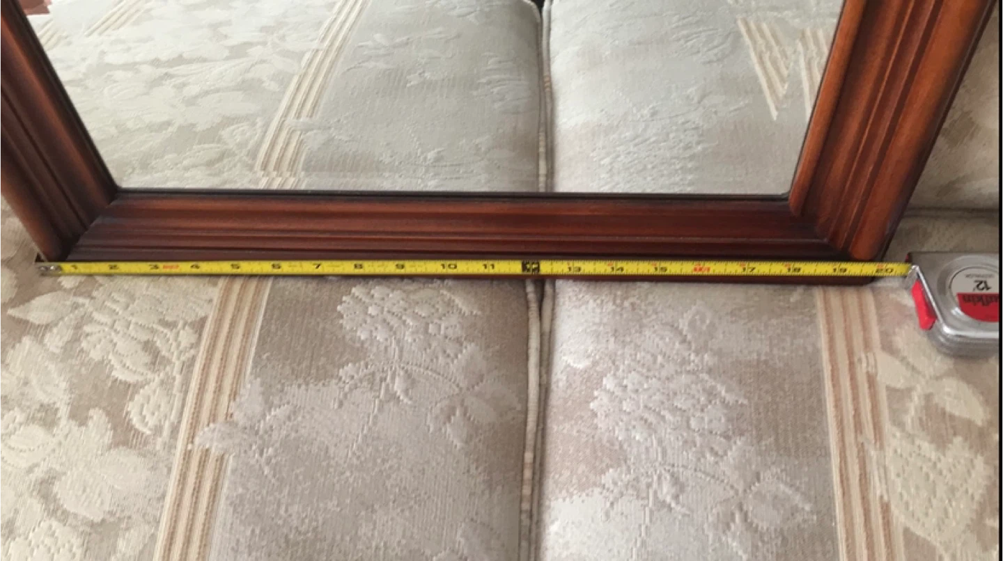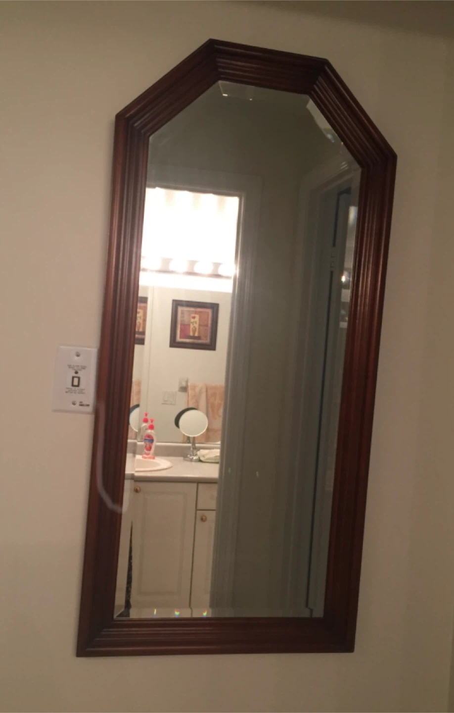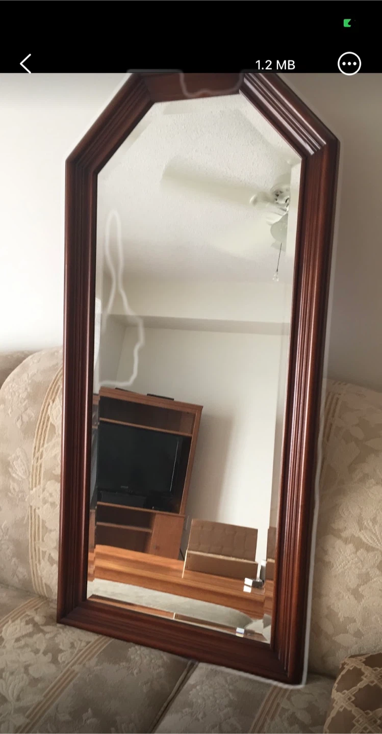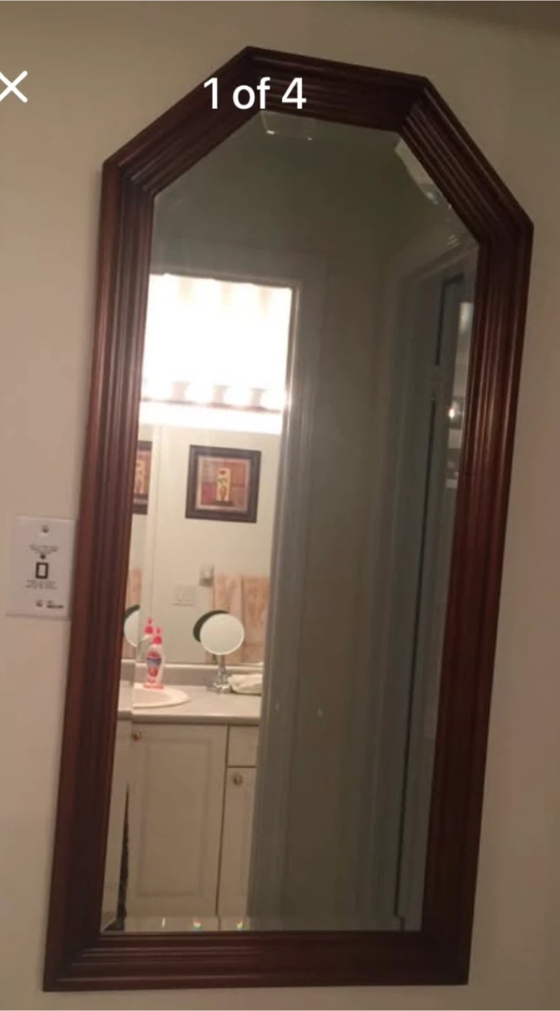 Here's a lovely mirror with a wooden frame! It's in great shape and would look fantastic in any room. The frame has a nice dark wood finish, adding a touch of elegance to your space.
