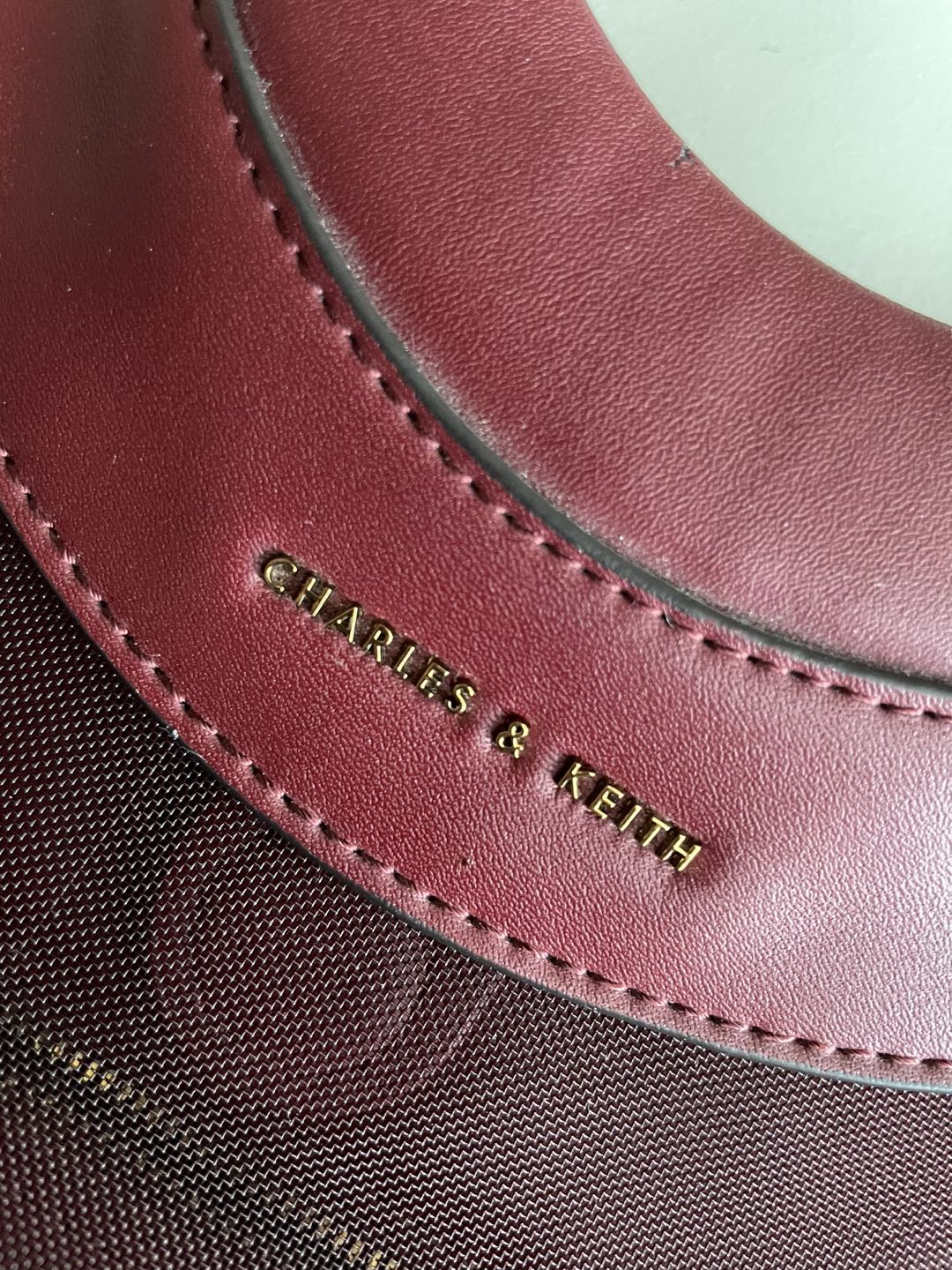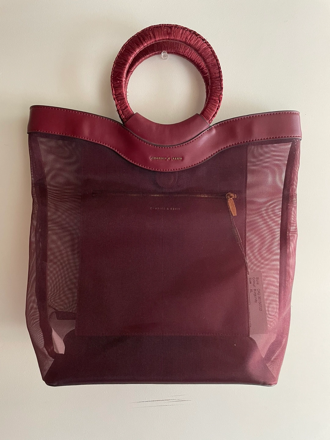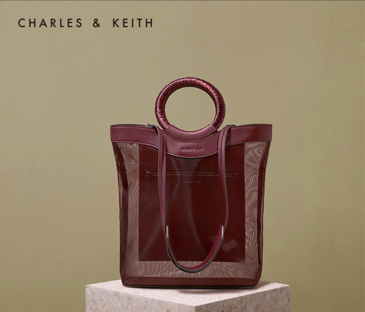 CHARLES & KEITH Mesh-Layer Front-Logo Magnetic-Closure Circular Top-Handle Tote Bag for Women - Burgundy.