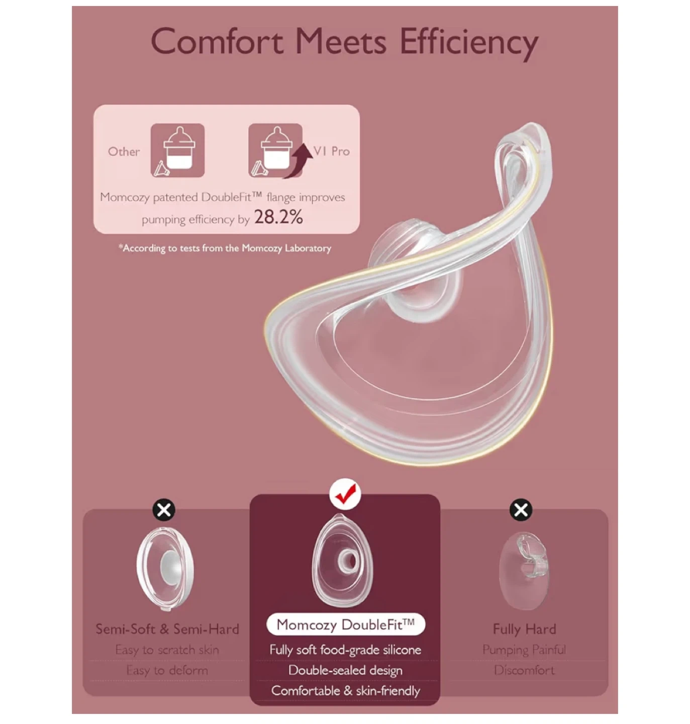 The double-electric hands-free breast pump empowers moms to multitask, weighing just 118g per cup and holding 180ml of breast milk each. The DoubleFit Flange endorsed by Momcozy's user testing research, ensures a superior fit for the breast and has the potential to increase milk production by 28.2%.