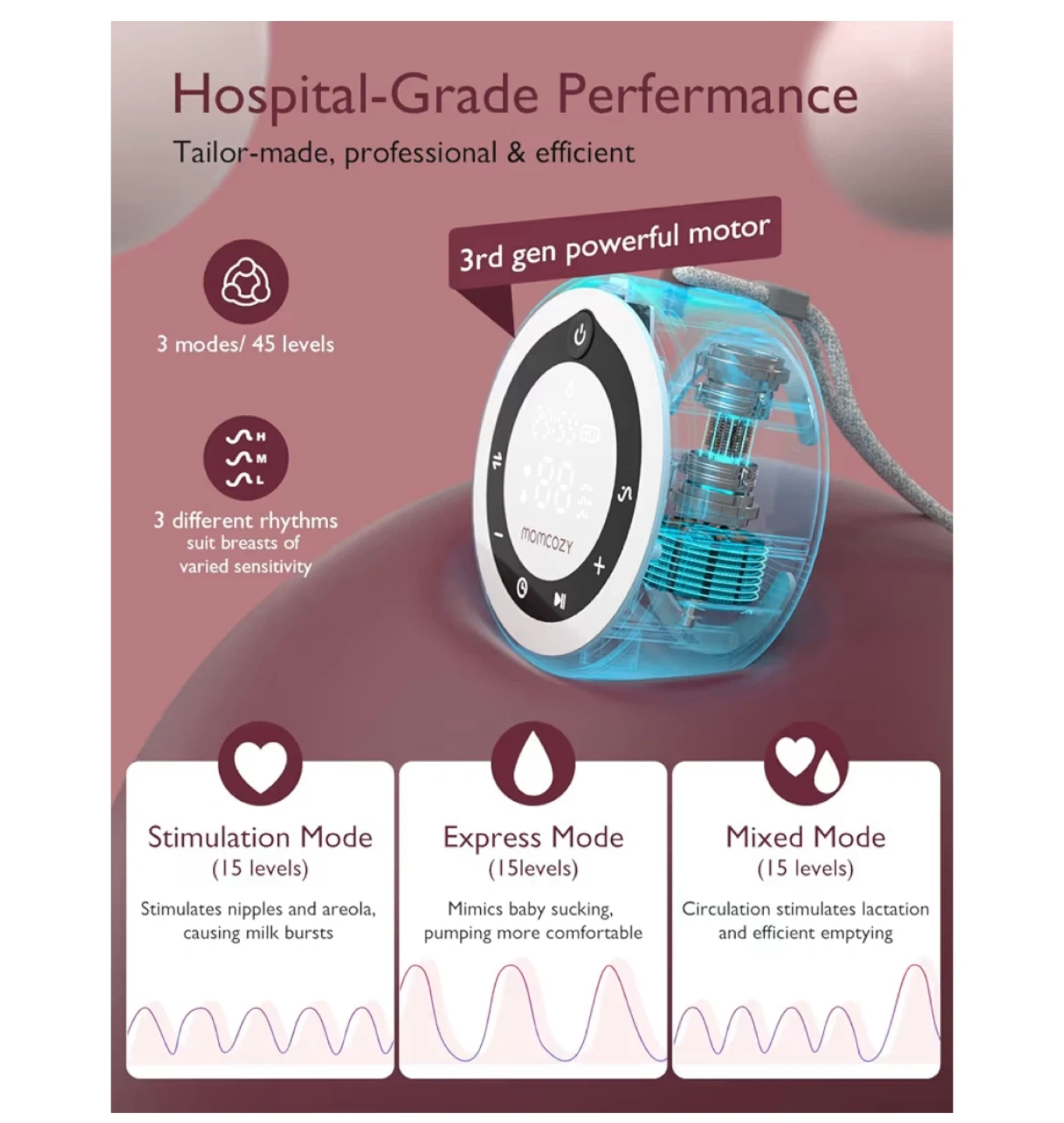 Features 3 Fine-Tuned Rhythms and 15 Suction Levels, mimicking the suckling patterns of babies at different hunger levels while also addressing nipple sensitivity at various stages. -300mmHg Mighty Suction ensures efficient and rapid breast emptying, reducing pumping time and ensuring maximum comfort.