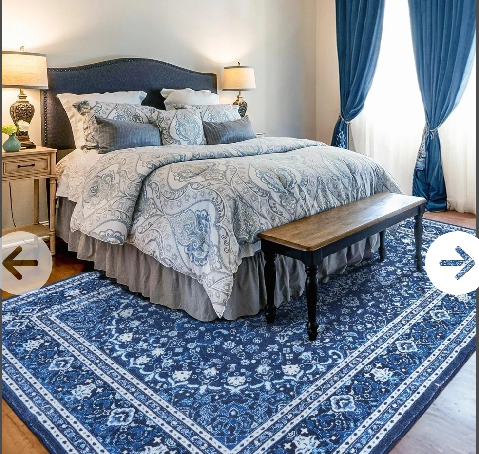 Washable Area Rugs 6x9, Boho Area Rug Low Pile for Bedroom Living Room Kitchen, Ultra-Soft Faux Wool Vintage Area Rug with Non-Slip Rubber, Kid & Pet Friendly, Blue White