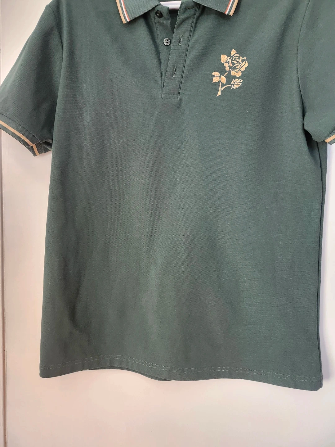 Selling a green polo shirt with a rose design and a pink sequin skirt! Both are in great condition and ready for a new wardrobe.