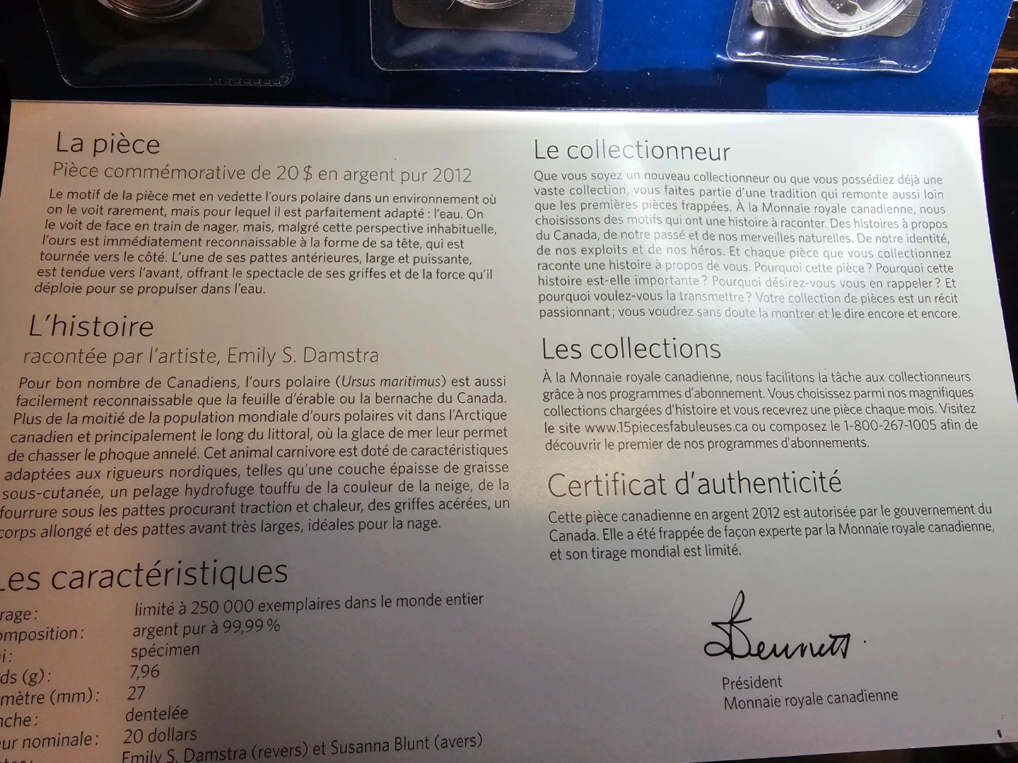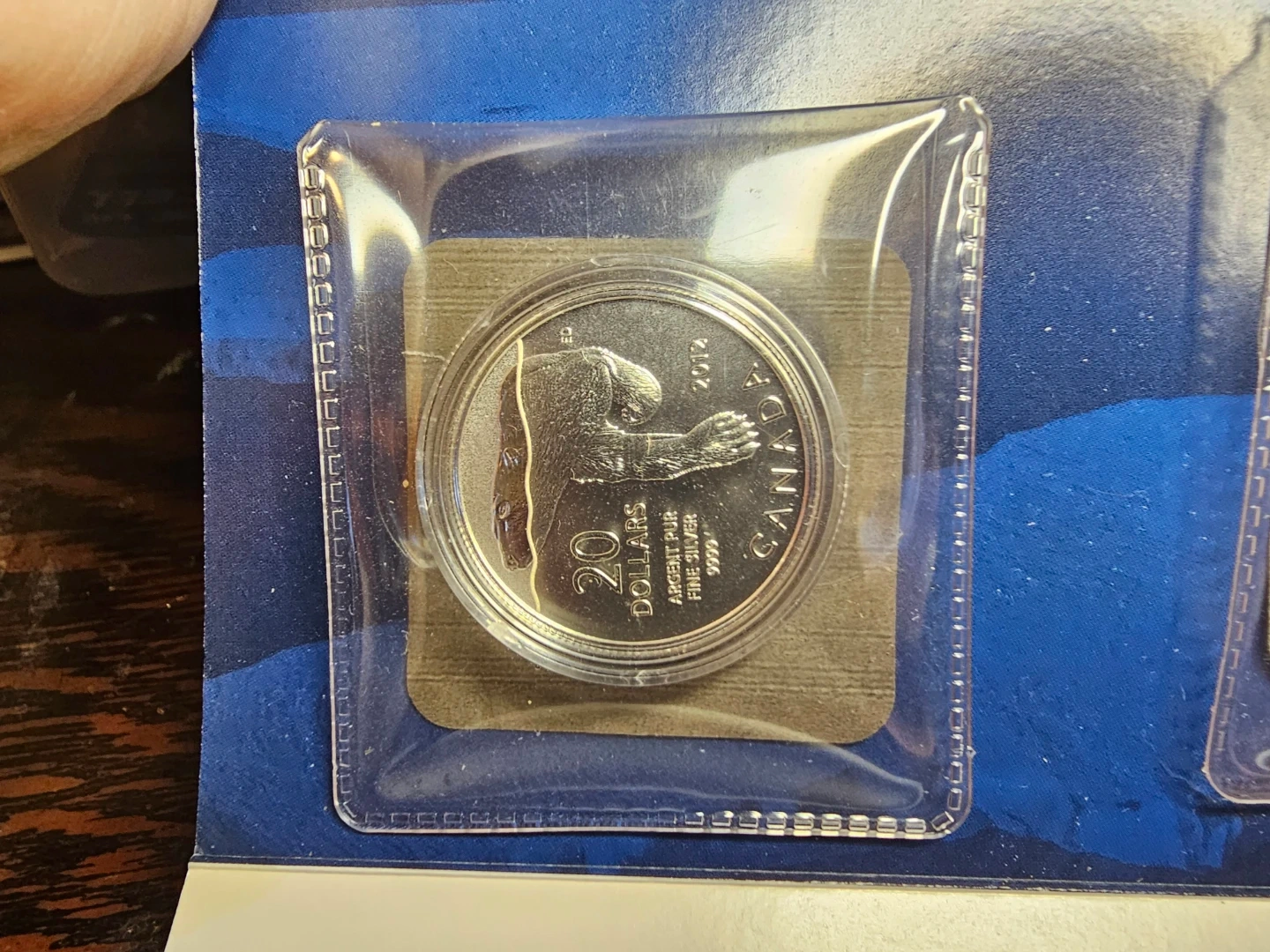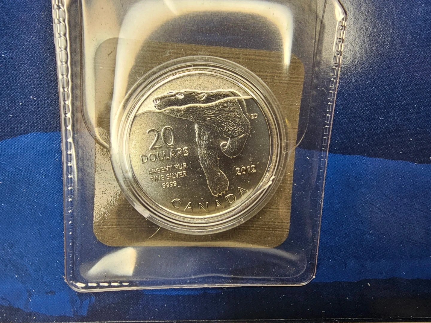 Selling a 2012 Canadian $20 pure silver coin featuring a polar bear design. This commemorative piece is a beautiful addition to any collection. The coin is made of argent pur 99.99% silver and has a limited mintage of 250,000 worldwide. It comes with a certificate of authenticity from the Royal Canadian Mint.