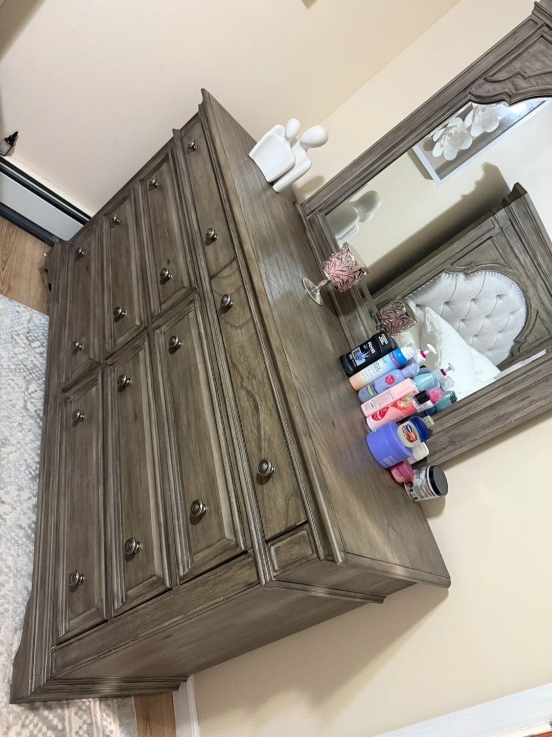 Selling a lovely wooden dresser with an attached mirror. It has a beautiful, classic design and would look great in any bedroom. It features multiple drawers for ample storage space. The dresser is in good condition.