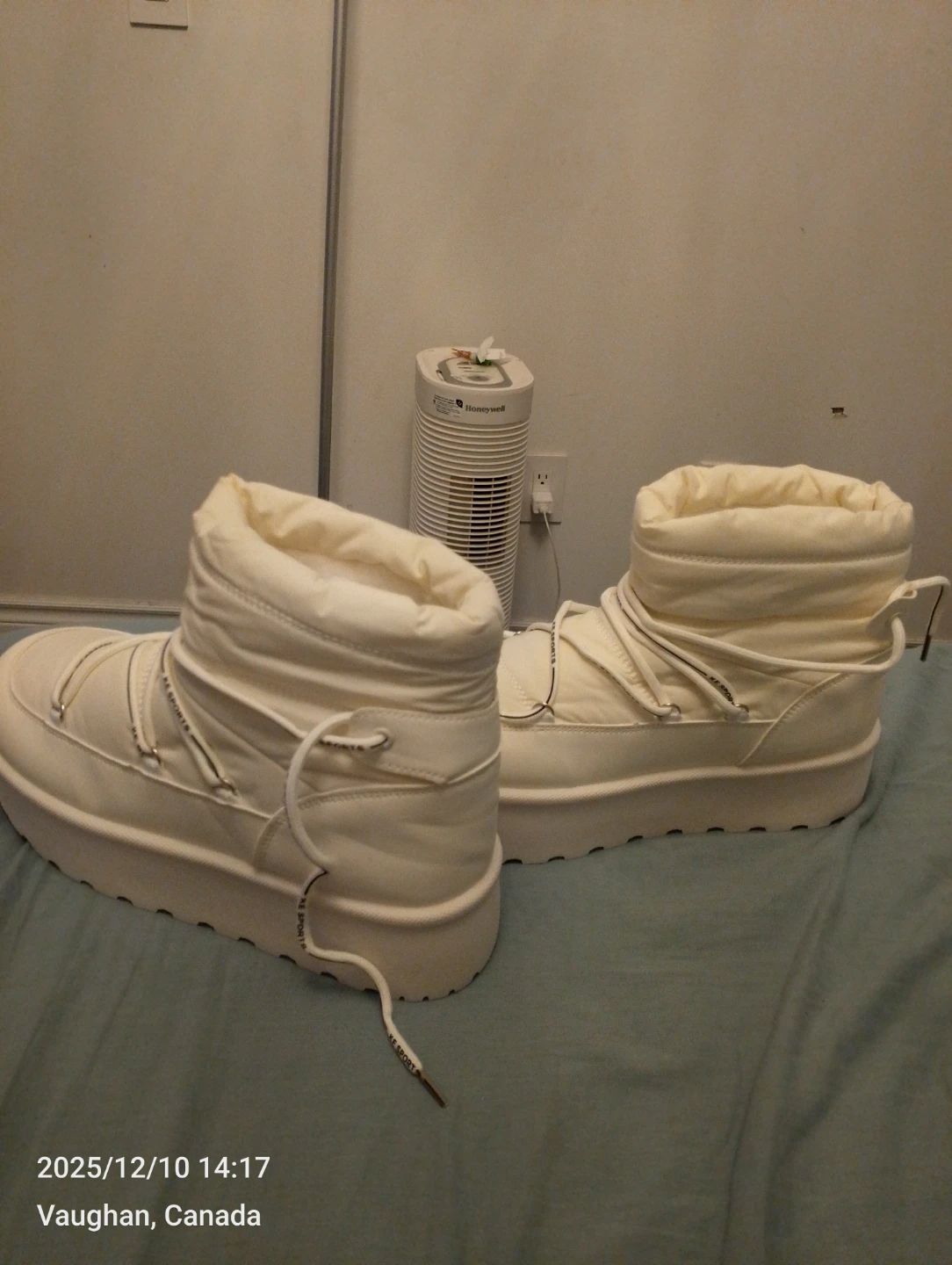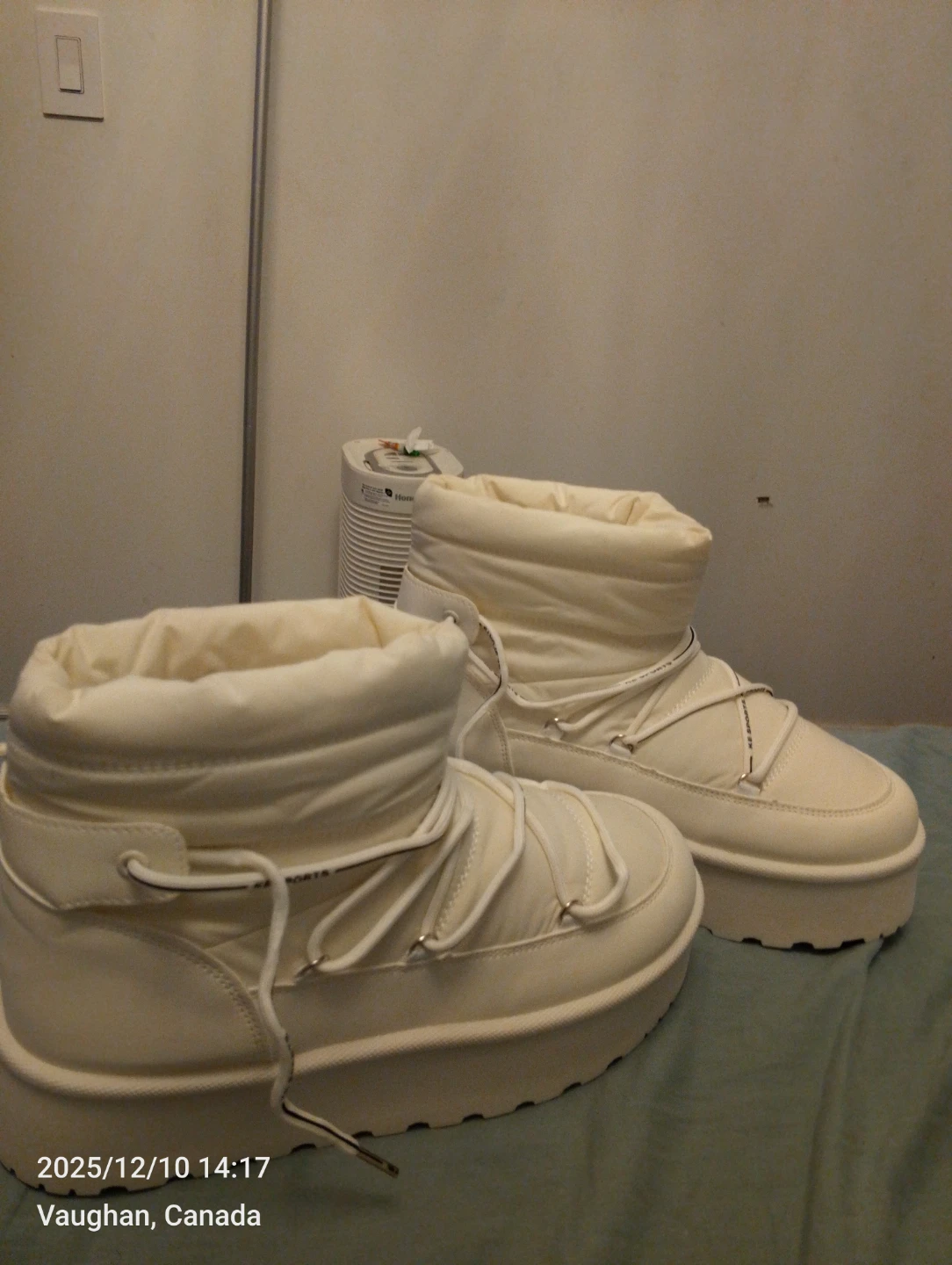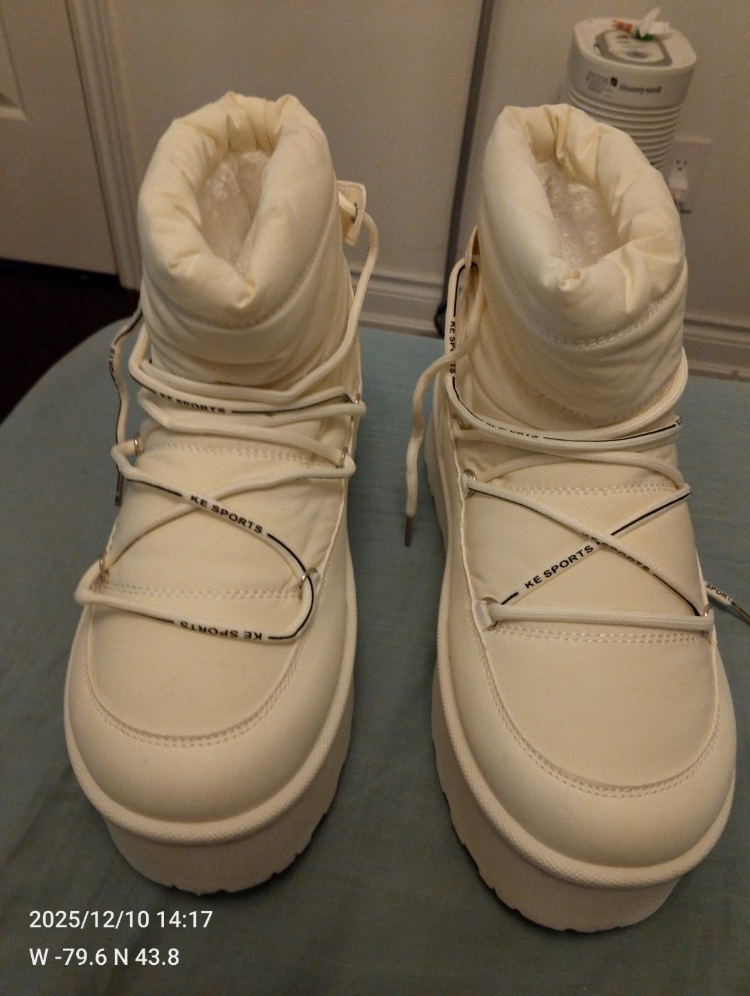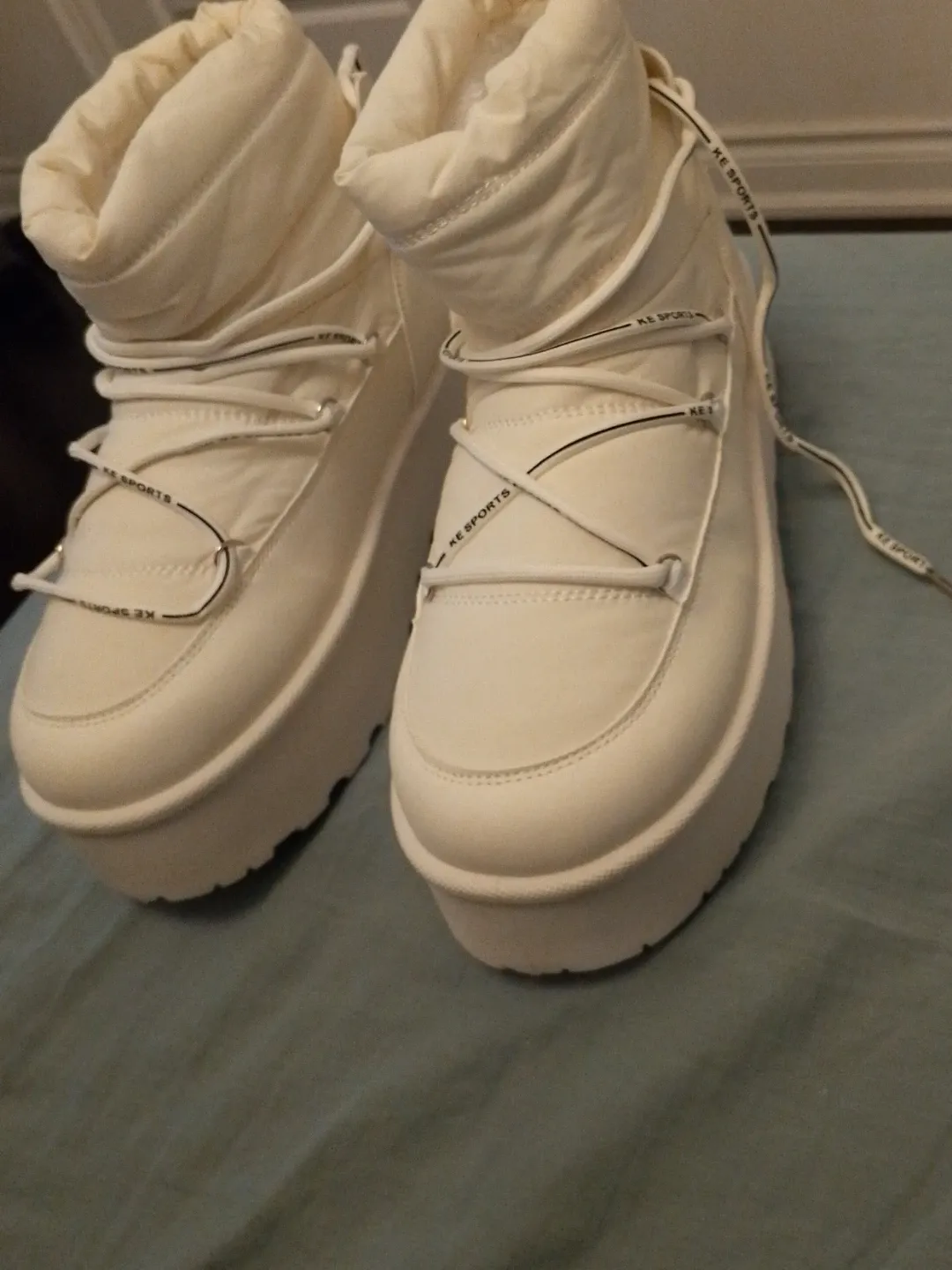 Selling a pair of white KE SPORTS platform winter boots in size 11, I'm selling them because they didn't fit when i got them which was 2 days ago so you could say they're size 10. they're great for winter and has faux fur in it to keep you warm. they're waterproof and great for walking in the snow. need to go before the 15th December