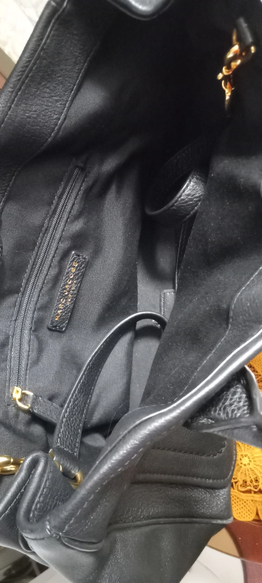 Selling a stylish black leather tote bag from Marc Jacobs! It's in great condition and perfect for everyday use. The bag has a classic design with a convenient outer pocket and gold-tone hardware.
