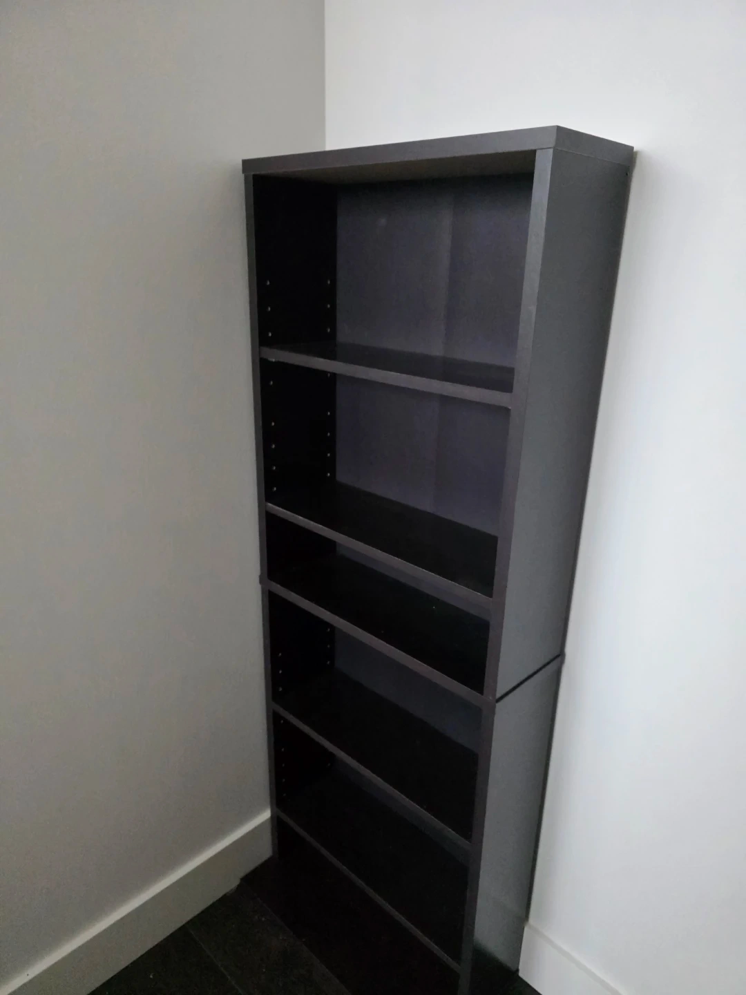 Lightly used small black bookcase for extra storage. Each shelf layer is adjustable in height.