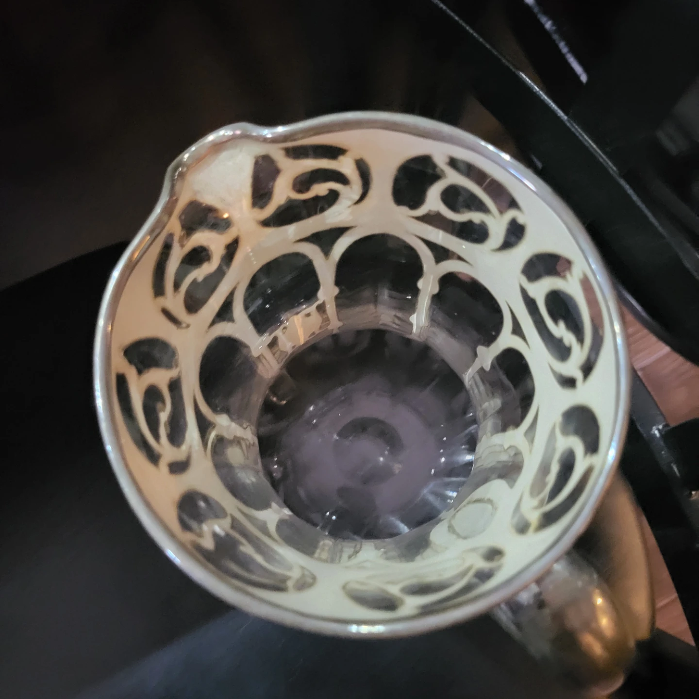 Selling a decorative glass pitcher with a unique design. It's in great condition and would make a lovely addition to any table setting or home decor. The pitcher has an ornate handle and a detailed cut-out pattern around the top. It's perfect for serving water, juice, or any other beverage in style!