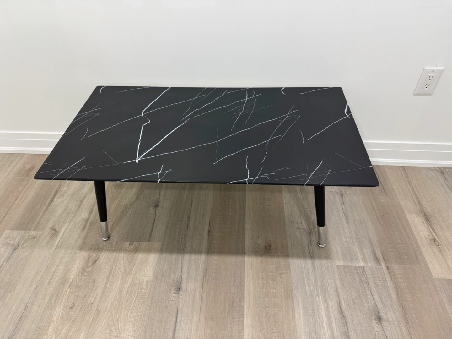 Selling a coffee table with a black marble-patterned top! It has a modern look with black legs and silver accents. It's in great condition and would look great in any living room