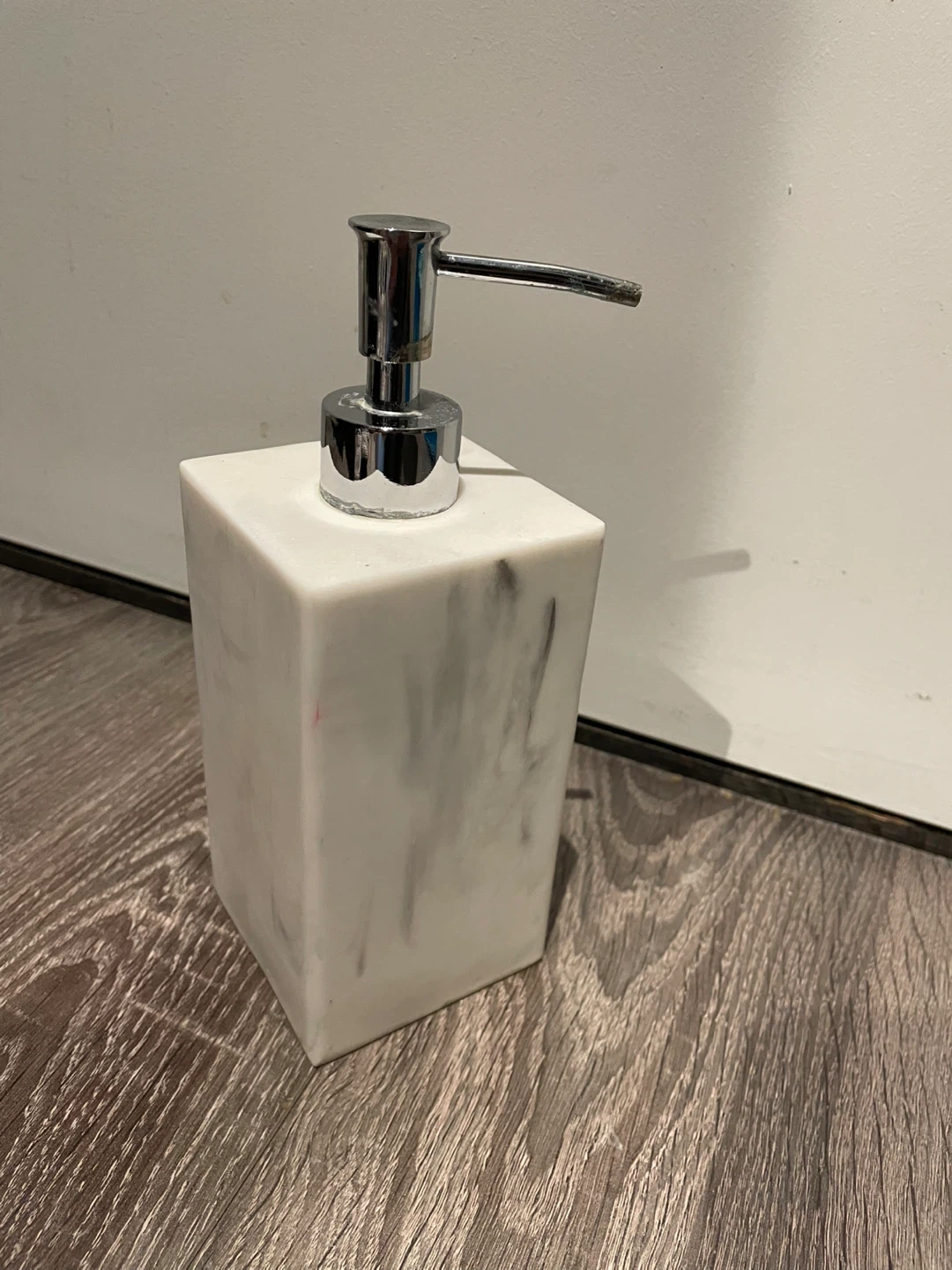 Selling a soap dispenser with a marble-like design. It has a chrome pump and a square shape. Perfect for adding a touch of elegance to your bathroom or kitchen!