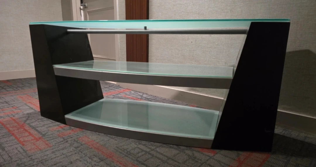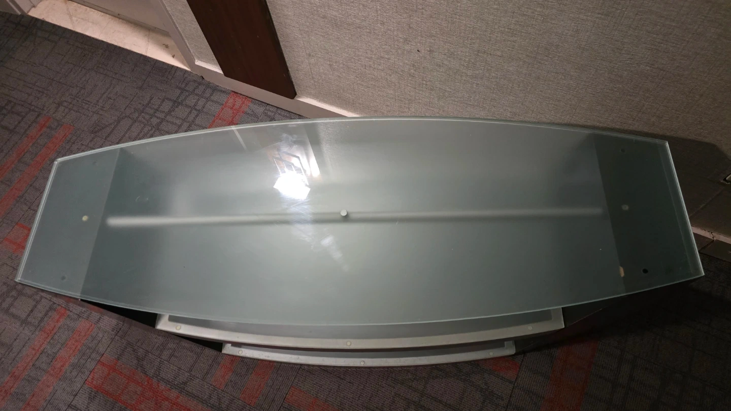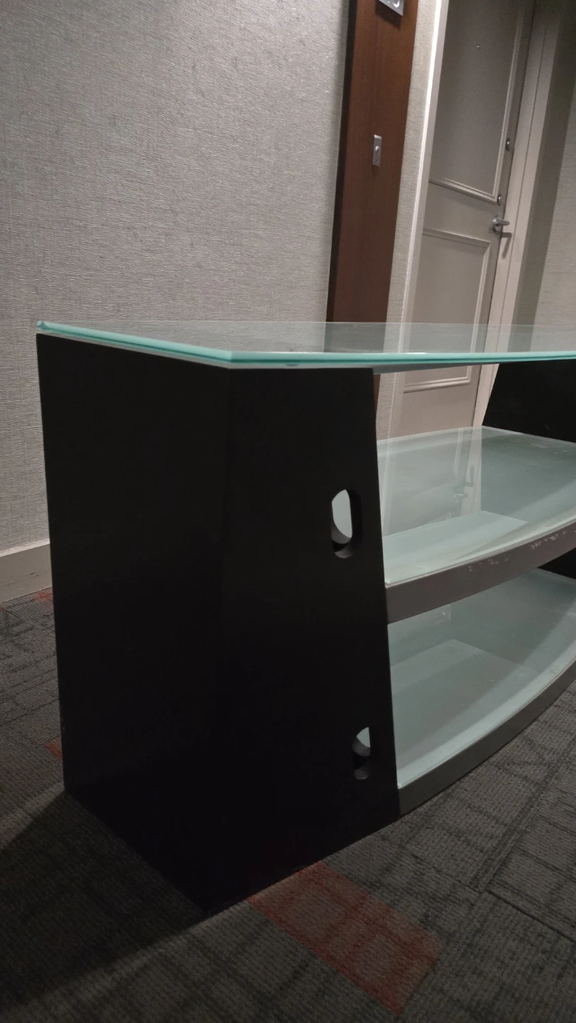 Glass TV / entertainment console with three frosted glass shelves and a sleek dark frame. Solid and heavy construction, great for TVs, media devices, or as a stylish display stand. In good used condition with light cosmetic wear consistent with age; glass is intact and sturdy.