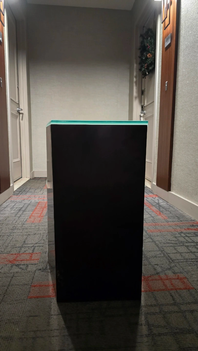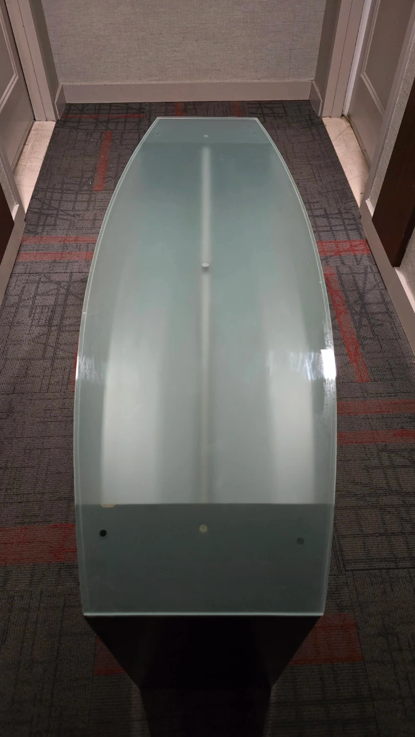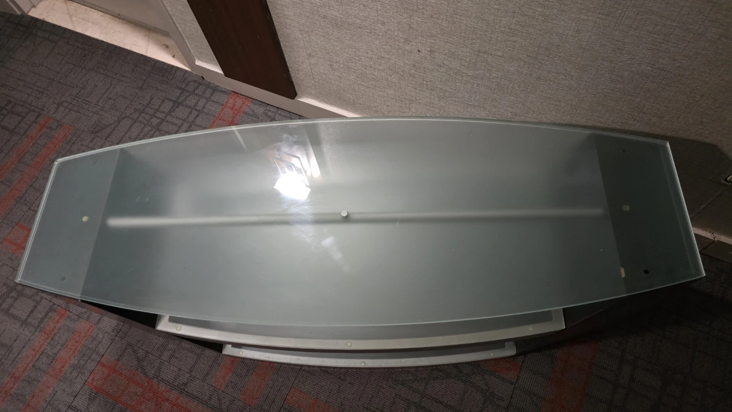 Glass TV / entertainment console with three frosted glass shelves and a sleek dark frame. Solid and heavy construction, great for TVs, media devices, or as a stylish display stand. In good used condition with light cosmetic wear consistent with age; glass is intact and sturdy.