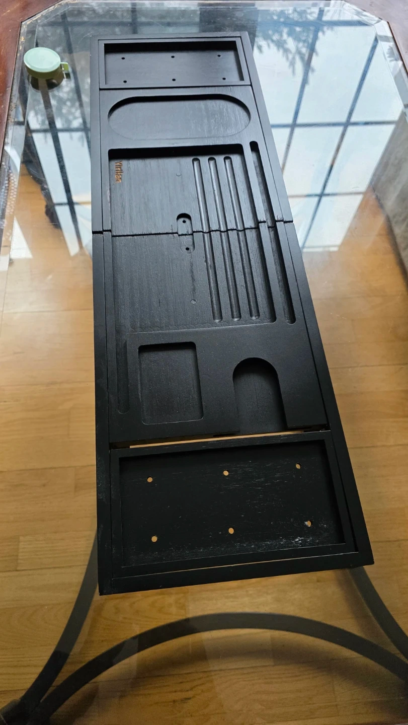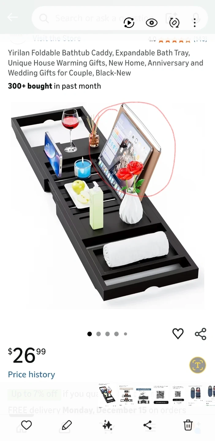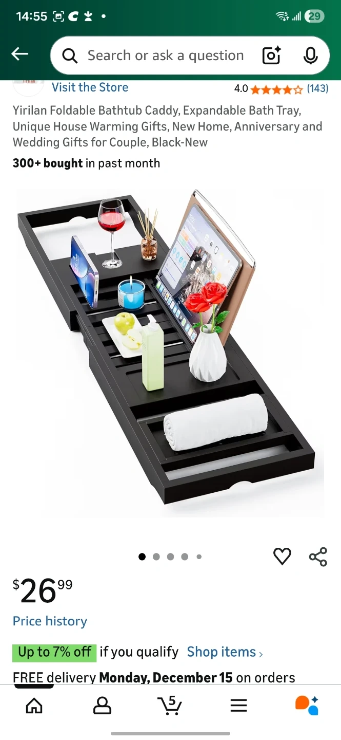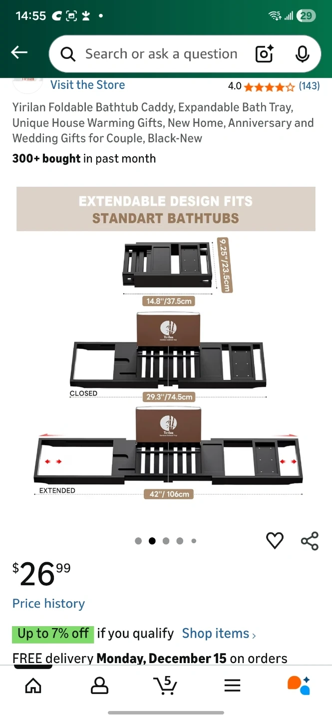 This is a Yirilan foldable bathtub caddy in black. It's an expandable bath tray perfect for adding a touch of luxury to your bath time. It's designed to fit standard bathtubs and can be extended to different lengths, up to 42 inches/106 cm. Originally bought for $26.99.