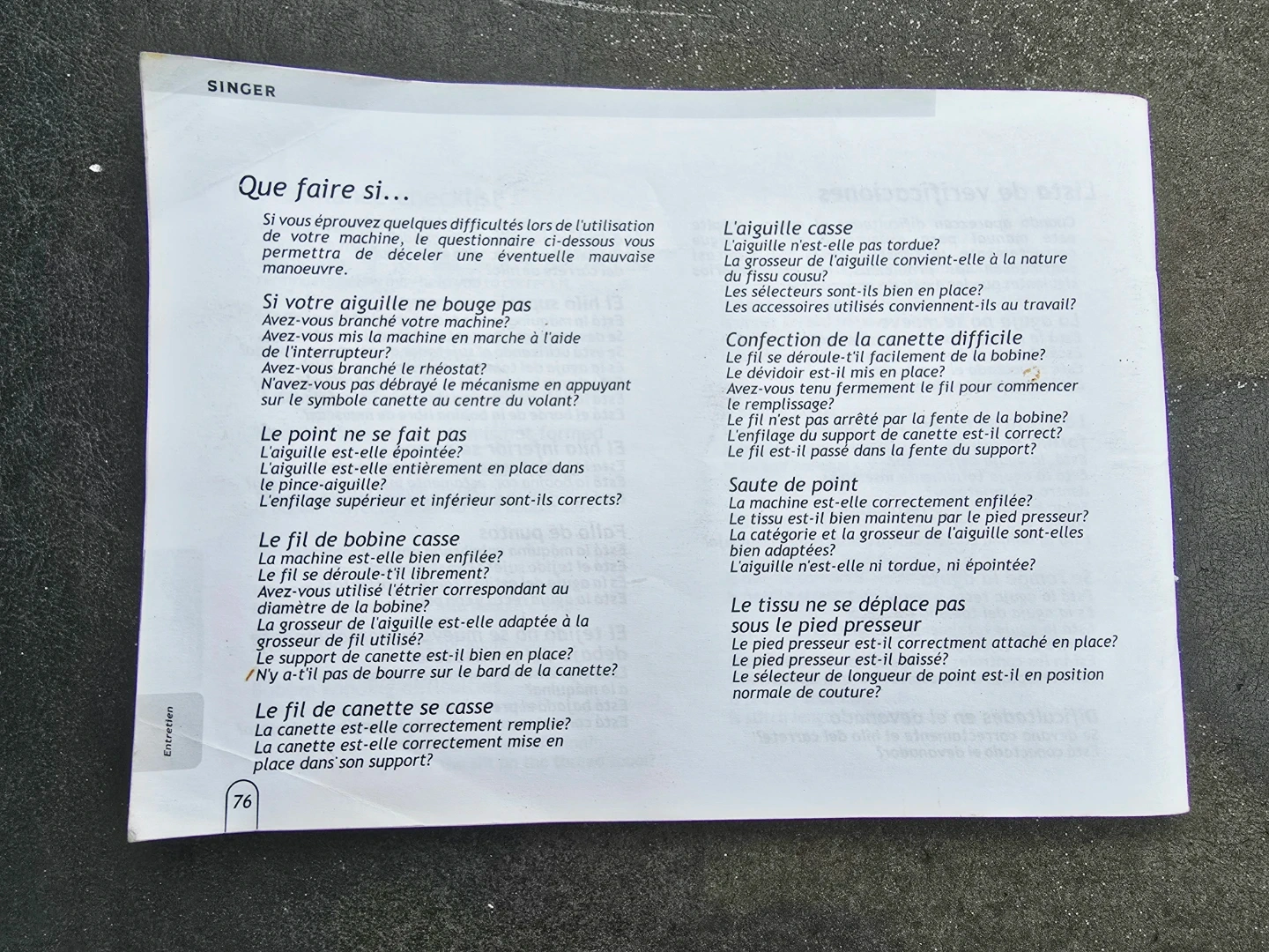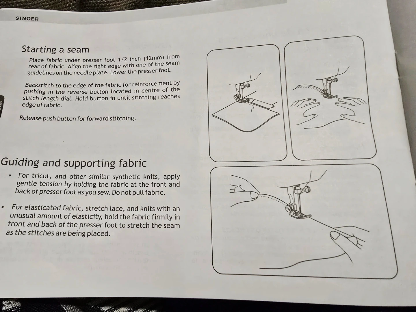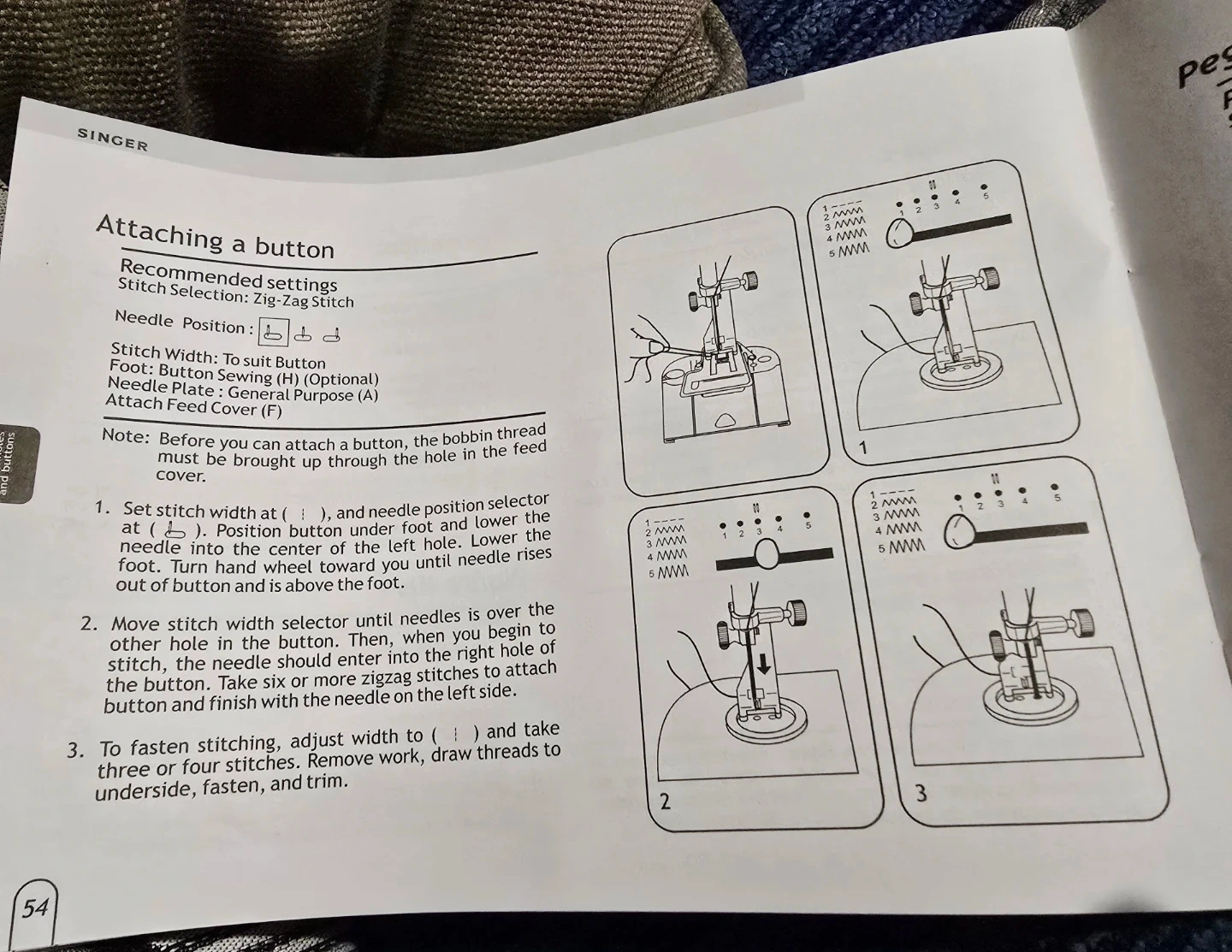 Selling a Singer 2517 sewing machine instruction book. It includes instructions for starting a seam, guiding and supporting fabric, and attaching a button. It also provides recommended settings for zig-zag stitches and needle positions