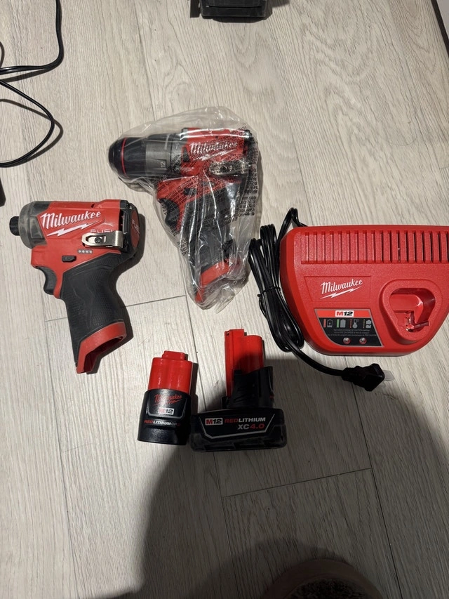 I'm selling almost new Milwaukee M12 Fuel Drill Kit. This compact and powerful kit includes the hammer drill, impact drillcharger, two batteries (one 4.0Ah and one 2.0Ah), and a carrying bag. While it's been used, it's in great condition and ready to get to work! * Compact and lightweight design * Fuel technology for enhanced performance * Includes drill/driver and impact driver * Comes with charger and two batteries * Convenient carrying bag for portability Please note, if the ad is up, it's available!